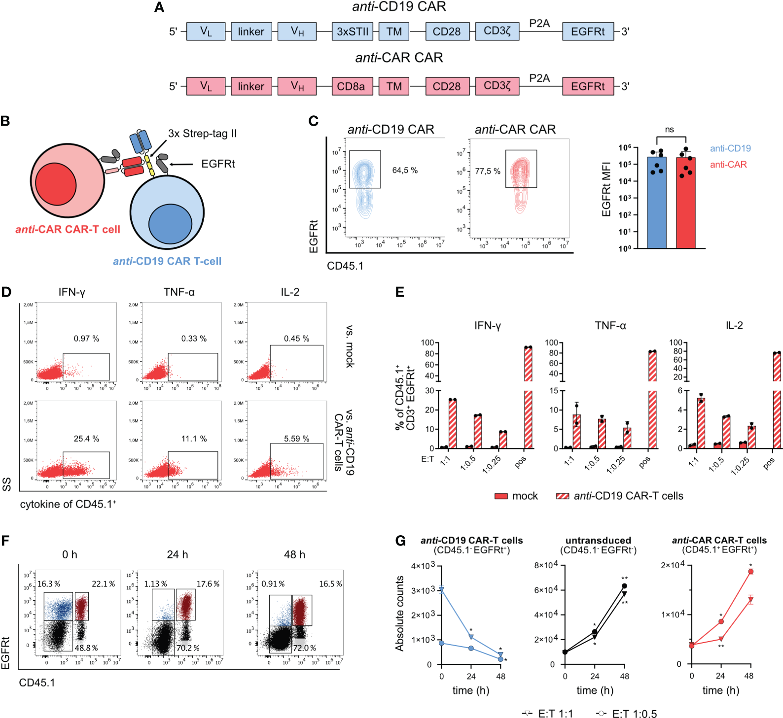 4x104 effector anti-CAR CAR-T cells (EGFRt+) were co-cultured with target anti-CD19 CAR-T cells (EGFRt+) at different effector to target ratios in 96-well U-bottom plate at a concentration of 7.5x105 cells/mL for 48 h. At the beginning of the incubation (0 h), and after 24 and 48 h, 200 µL of the cell suspension was harvested for surface marker antibody staining of congenic markers (CD90.1, CD45.1), CD3, CD8, CD19 and EGFRt. Staining for live/dead discrimination was performed with propidium iodide. As bulk CAR-T cell products were used, the number of transferred cells always refers to the amount of congenic marker+ EGFRt+ cells. The total amount of transferred cells was defined by flow cytometry according to the expression of the EGFRt marker.