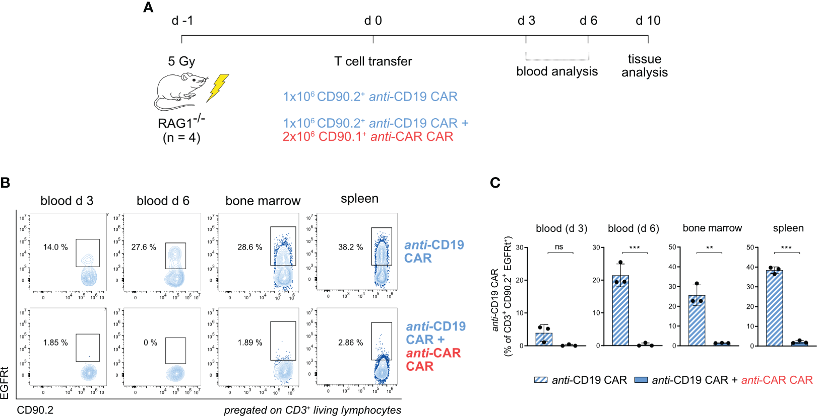 For the co-injection model, Rag-/- or C57BL/6 mice were sublethally irradiated (5 Gy) the day before the simultaneous adoptive transfer of 1x106anti-CD19 CAR-T cells and 2x106anti-CAR CAR-T cells by intravenous injection (i.v.). Transferred cells and B cells were followed in the blood at different time points and in bone marrow, spleen and lymph nodes at the endpoint.