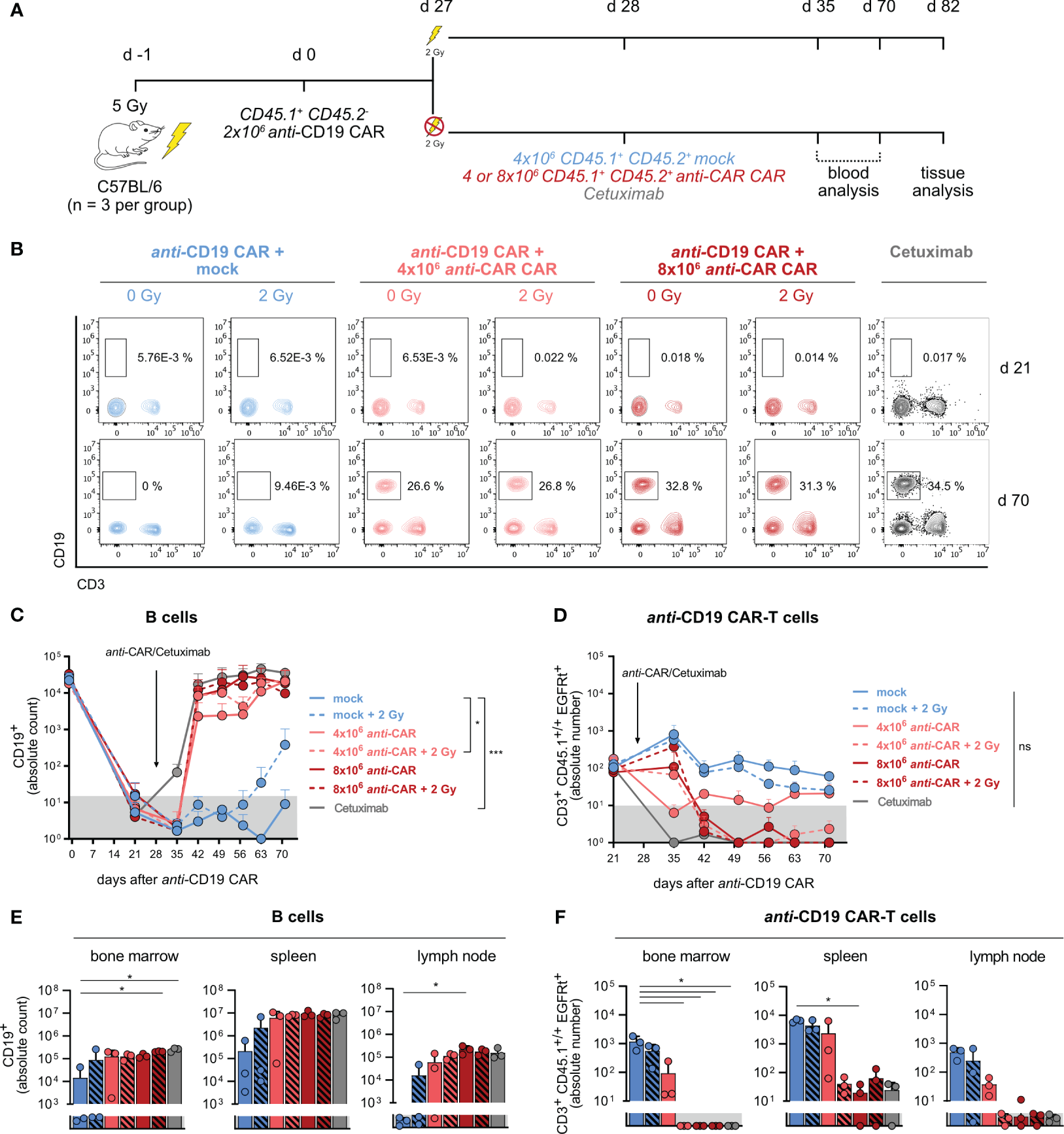 For the therapeutic model, 2x106anti-CD19 CAR-T cells were transferred i.v. into sublethally irradiated mice (5 Gy). After 27 days, mice were either or not irradiated with a 2 Gy dose and treated the day after i.v. with 4x106 or 8x106anti-CAR CAR-T cells, or 4x106 mock T cells (CAR construct without the scFv). Moreover, one group received the monoclonal antibody Cetuximab (1mg per mouse) (Bristol-Myers Squibb) by intraperitoneal injection. Transferred cells and B cells were followed in the blood at different time points and in bone marrow, spleen and lymph nodes at the endpoint.