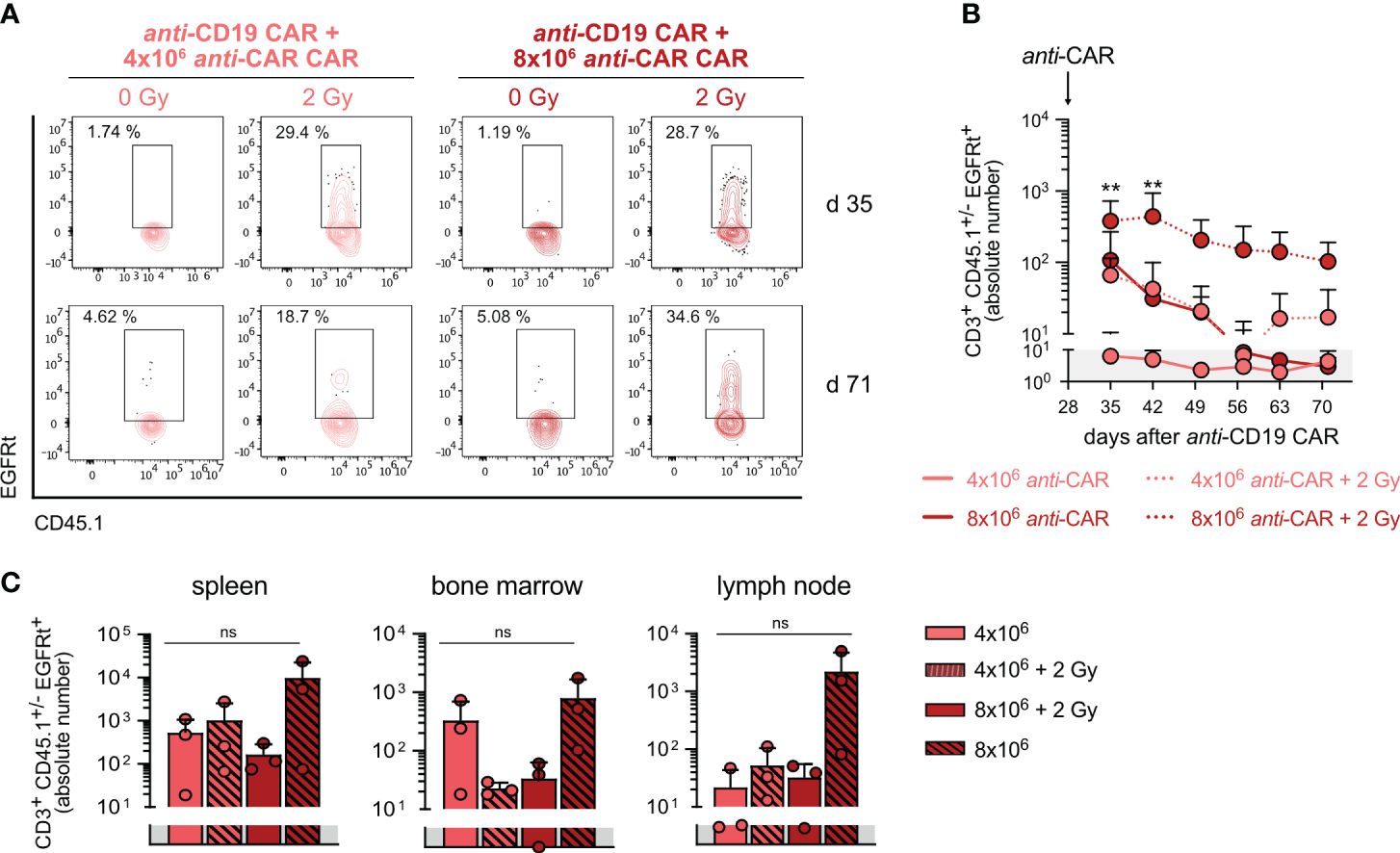 We finally examined the persistence of the anti-CAR CAR-T cells and observed a clear relationship between the cell dose and pre-conditioning. As expected, irradiation facilitated engraftment of the transferred cells regardless of cell doses. Indeed, circulating anti-CAR CAR-T cells remained detectable only in irradiated mice (Figures 5A, B), with the highest frequencies observed in mice receiving 8x106 cells plus irradiation in both blood and tissues (Figure 5). Intriguingly, the higher cell dose compensated for the absence of pre-conditioning, at least during the initial weeks in the circulation, as indicated by comparable levels between the groups 8x106 cells vs 4x106 cells plus irradiation (Figure 5B). Although the amount of anti-CAR CAR-T cells declined to undeletable levels in the blood of mice receiving this high cell dose at later time points, tissue infiltration remained consistent and comparable to the other groups (Figure 5C). Taking into account the similar kinetics of B-cell reconstitution and complete anti-CD19 CAR-T cell depletion, we could conclude that this condition (8x106 cells, no irradiation) would be still efficient.