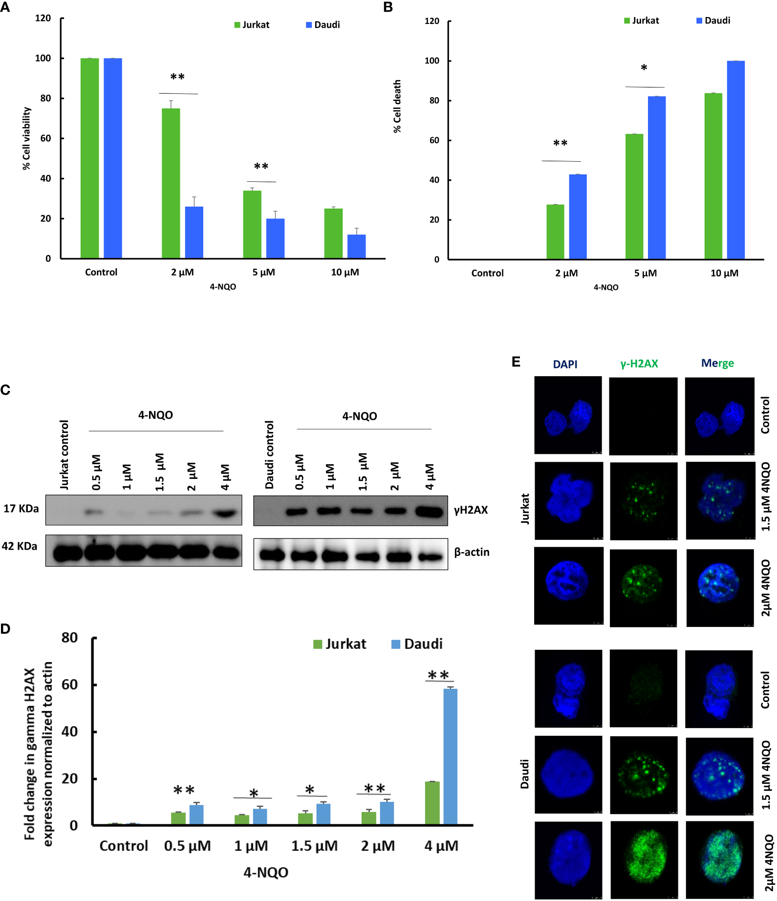 Effect of 4-NQO on Jurkat and Daudi cells. (A) Determination of cell viability of Jurkat and Daudi cells by MTS assay following treatment with 4-NQO (0, 2, 5, and 10 μM) in 48-well plates. (B) Determination of cell death of Jurkat and Daudi cells by trypan blue assay following treatment with 4-NQO (0, 2, 5, and 10 μM) in six-well plates. Data presented is derived from three individual experiments, and error bars are indicated. (C) Jurkat and Daudi cells were treated with different concentrations of 4-NQO at 0, 0.5, 1, 1.5, 2, and 4 μM individually for 48 h, and γH2AX expression was determined. (D) Densitometric analysis of the γH2AX blots when normalized to β-actin endogenous control. (E) Immunofluorescence analysis of γH2AX in 1.5 and 2 μM 4-NQO-treated Jurkat and Daudi cells. The experiments were repeated twice. Mean ± SD, ns, non-significant, *P-value <0.05 and **P-value <0.01.
