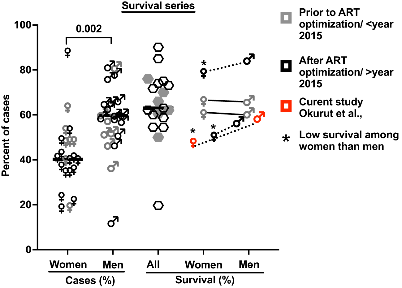 The proportion of cases with HIV-associated CM by gender and of related survival by gender in 21 published case series. These studies include 38,485 cases with 5,834 reported deaths, which accounted for a 15.2% case fatality rate (see Supplementary Table 1 for details and references (7, 9, 16, 26, 28–44)). Bars show median values. Five studies report survival by gender (four references and this report; Supplementary Table 1). * Shows published data with significantly low survival among women treated for cryptococcal meningitis compared to men.