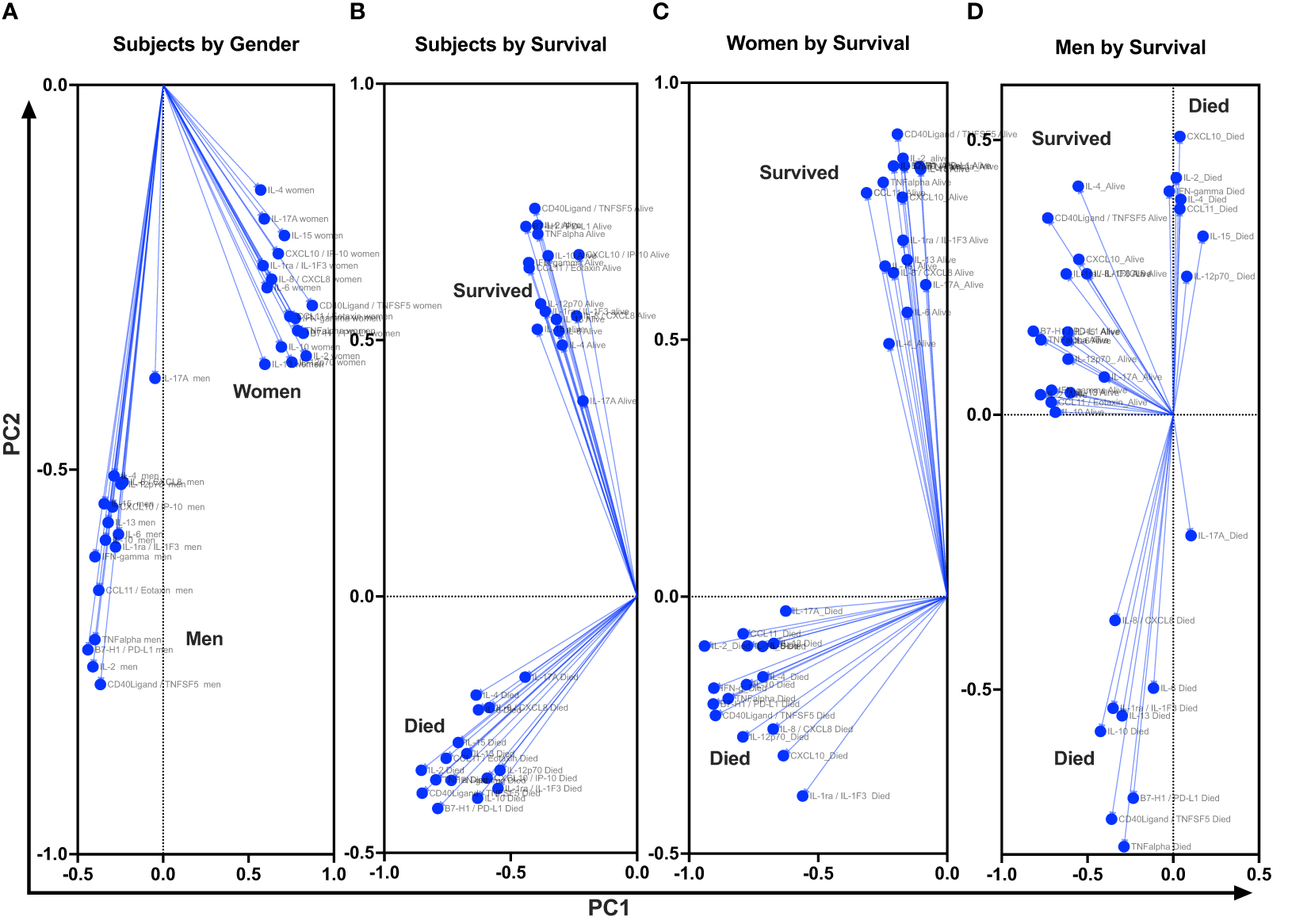 Projection of cytokine responses on eigenvector correlation covariates on PC1 and PC2 (axes) using unsupervised principal component analysis. Baseline cerebrospinal fluid (CSF) immune signature among participants who were diagnosed with HIV-associated CM showed distinct clusters by gender and by survival. PC, principal component. Dots show individual cytokines produced among participants projected on eigenvector correlation covariates. Variables near the center (0; zero) are uncorrelated to the model, and variables further away from the center (0; zero) are strongly correlated to the model. Variables among all cytokine projected on the variety of CSF cytokine patterns among participants by host survival (Figure 3A). The CSF secreted cytokines clustering by gender (Figure 3B). Cytokine clustering by female survival (Figure 3C). Cytokine clustering by men’s survival (Figure 3D).