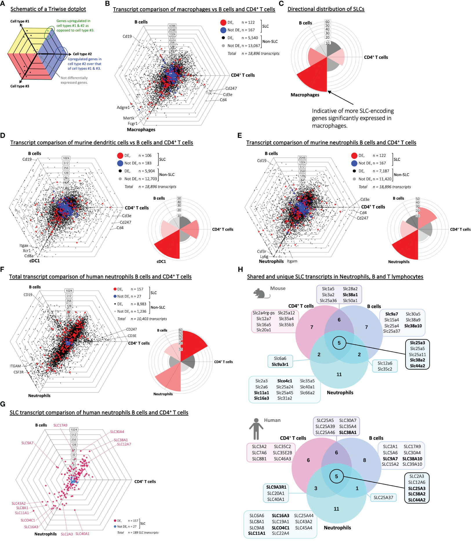 Phagocytes display a pronounced SLC transcriptome profile compared to B and T lymphocytes. (A) A schematic drawing of a Triwise dot plot, which explains how to interpret the gene expression comparisons between three samples or cell types. The direction of a dot shows in which cell type the gene is upregulated, while the distance from the center of the plot indicates the strength of upregulation – similar to log fold change. Genes with the same expression in all three cell types will lie close to each other in the center, regardless of the magnitude of their absolute expression levels (indicated by grey dots). The colored background in the plot (i.e., yellow, blue or red) depicts the zones, in which upregulated genes in each sample (cell type #1, #2 or #3 respectively) will be located after gene expression transformation into barycentric coordinates. When a gene is equally upregulated in two samples compared to the third sample, the dot will locate to the intersection between two zones (e.g., the green dots). (B, C) Triwise dot plot and rose plot of RNA-Seq data (GSE109125) from splenic immune cell subsets of the adaptive immune system (B cells and CD4+ T cells) versus macrophages sorted from mice. (D, E) Triwise comparisons and rose plots of murine cDC1 dendritic cells, B cells and CD4+ T cells (D) and between murine neutrophils, B cells and CD4+ T cells (E). (F) Transcript Triwise comparison and rose plot of human PBMC-derived neutrophils, B and CD4+ T lymphocytes (GSE107011). (B, D-F) In the Triwise dot plots, genes are indicated with black dots (•) and SLC-encoding genes with red dots (•) when significantly different expressed. Genes are indicated with grey dots (•) and SLC-encoding genes with blue dots (•) when not differentially expressed. Labels on the dot plot grid lines indicate transcript fold changes (up to 4,096 folds) of reads in one cellular subset versus another. Genes encoding known cell-specific markers are indicated for each cell type: Cd19 (CD19), Cd247 (CD247), Cd3e (CD3E), Cd4 (CD4), Adgre1 (F4/80), Mertk (MER proto-oncogene, Tyrosine Kinase), Fcgr1 (Fc receptor, IgG), Itgax (CD11c), Xcr1 (XC motif chemokine Receptor 1), Cd8a (CD8 subunit Alpha), Csf3r (Colony Stimulating Factor 3 Receptor), Ly6g (Ly-6G) and Itgam (CD11b). (C-F) Labels on the rose plot gridlines indicate the number of genes (ranging from 10-60) included in each of the six rose petals/buckets. (G) Triwise comparison of SLC transcripts in human neutrophils, B cells and CD4+ T cells (GSE107011). Differentially expressed SLCs are depicted in magenta (•) and non-differentially expressed SLCs in light blue (•). Individual, highly and significantly different expressed SLCs are highlighted and labelled with their gene name. Labels on the dot plot grid lines indicate transcript fold changes (up to 1,024 folds) of reads in one cellular subset versus another. (H) Venn diagrams of the top 20 highest expressed SLCs in neutrophils, B cells and CD4+ T cells in mouse (upper panel) or in human (lower panel) RNA-Seq data sets (GSE109125 and GSE107011 respectively). Gene names highlighted in bold are shared between the two data sets.