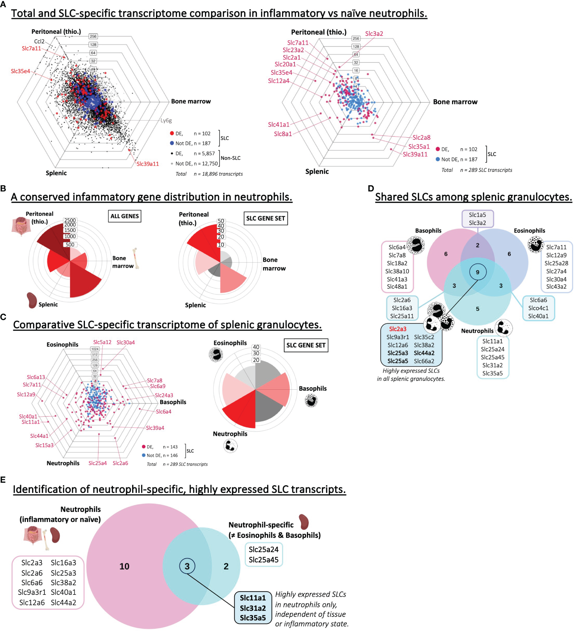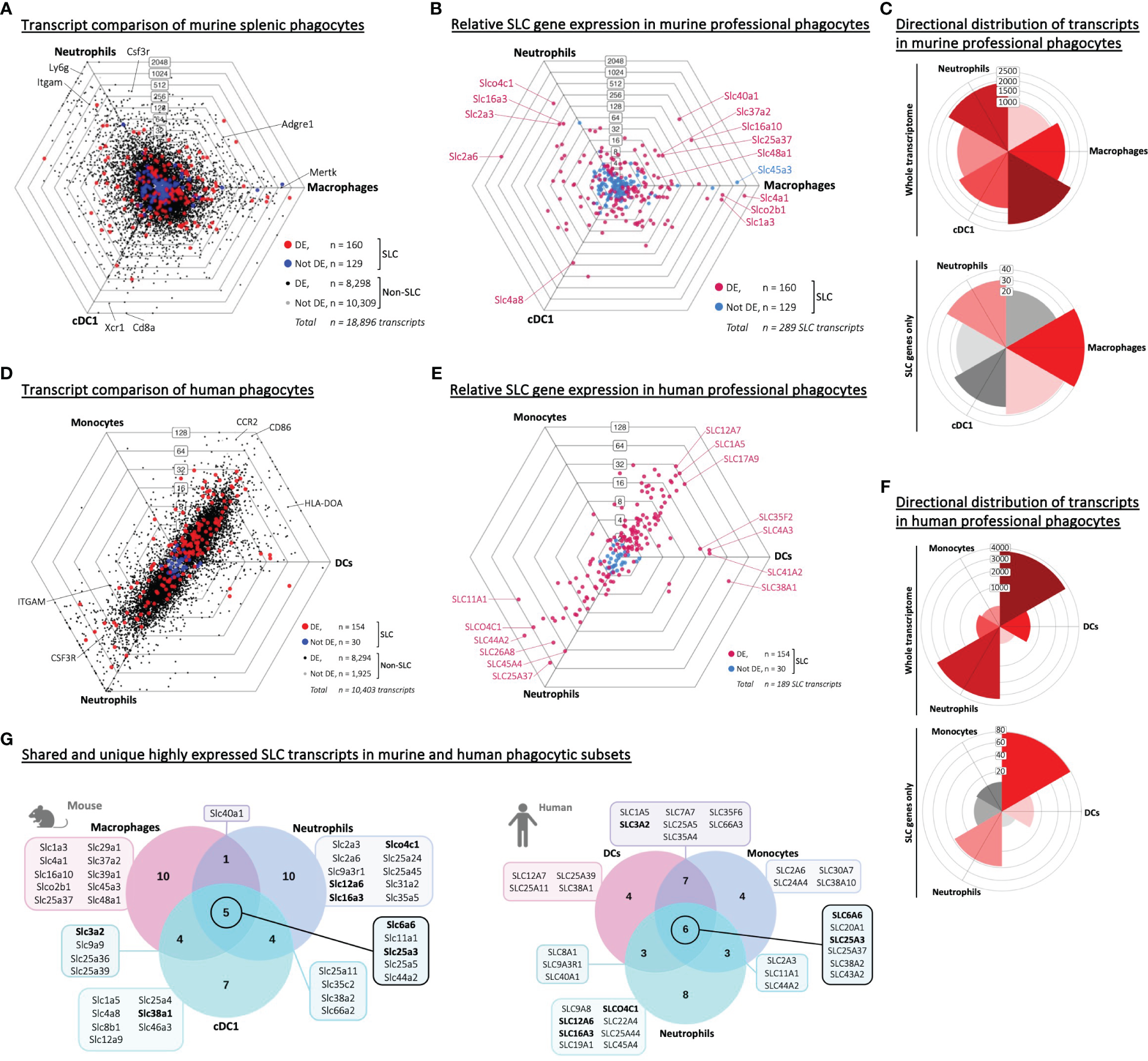 Here, using publicly available gene expression data sets (RNA-Seq), we first derive new insights into the expression patterns of SLCs in the phagocytic myeloid populations versus B and T lymphocytes. Second, we focus more directly on the SLCs of three major phagocytic cell types: macrophages, dendritic cells, and neutrophils. Using a bioinformatic tool, Triwise, which allows three-way comparisons between transcriptomes, we have designed online interactive plots, through which researchers can explore the expression of a gene of interest and easily assess its relative expression and statistical significance between three subsets of immune cells. Our investigations reveal that SLCs are expressed significantly higher in professional phagocytes compared to B and T lymphocytes, and allude to a significant role for SLC11A1 (also known as NRAMP1) in phagocytes. Specific to macrophage subsets deriving from various tissues, the heme transporter SLC48A1 (also known as HRG1) was highly upregulated compared to other professional phagocytes or adaptive immune cells. Finally, it may be possible to use the high transcript levels of specific SLCs as novel markers for specific dendritic cell subsets, and we could confirm a role for amino acid transporters (SLC3/SLC7 family) in neutrophils in inflammatory settings.