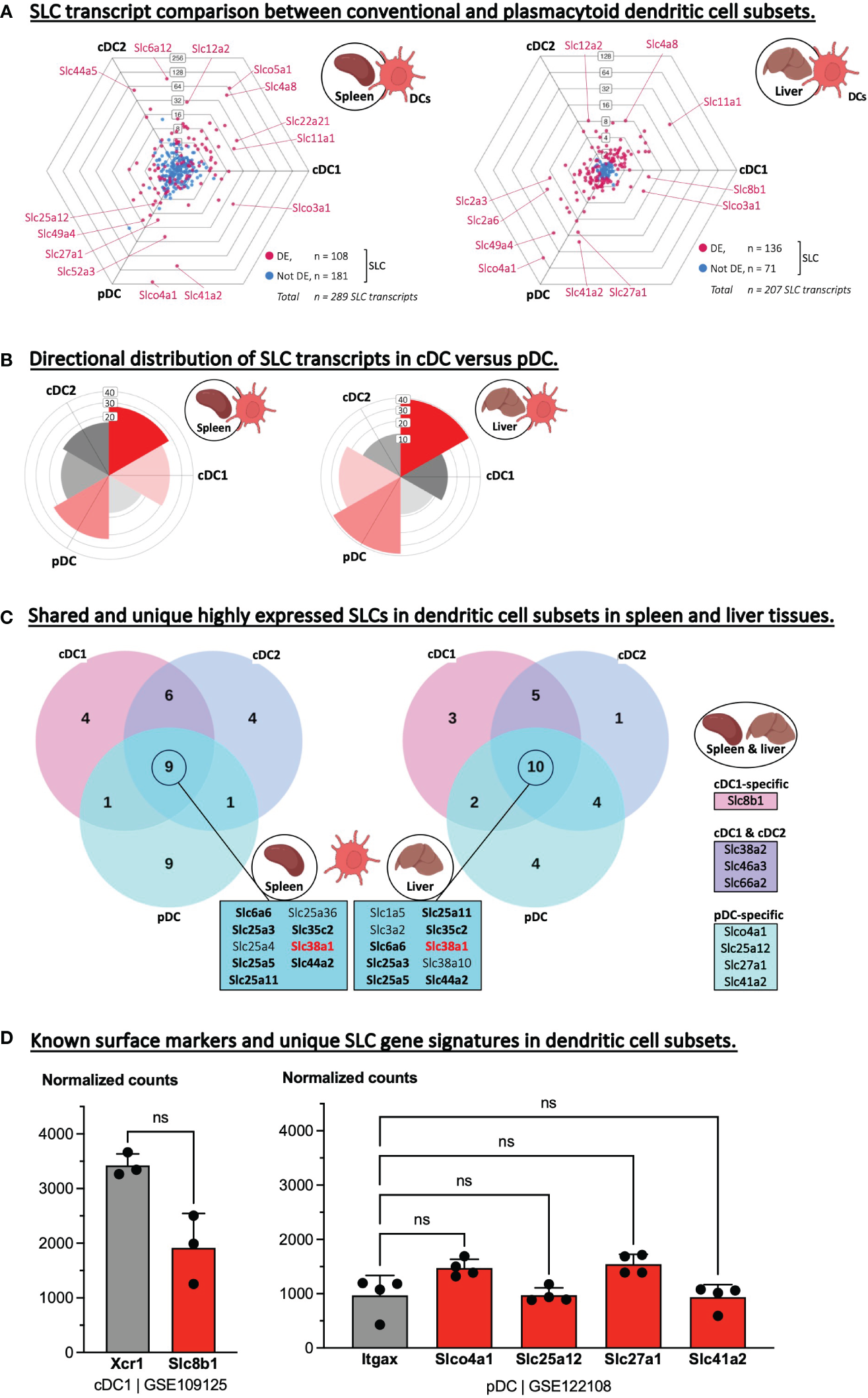 Shared and unique SLC signatures are expressed in distinct phagocyte populations from the same tissue of origin. (A, D) Triwise dot plot of RNA-Seq data sets representing three phagocyte populations: Murine splenic macrophages, neutrophils and cDC1 dendritic cells (GSE109125 in A) or human PBMC-derived monocytes, neutrophils and dendritic cells (GSE107011 in D). Genes are indicated with black dots (•) and SLC-encoding genes with red dots (•) when significantly different expressed. Genes are indicated with grey dots (•) and SLC-encoding genes with blue dots (•) when not differentially expressed. Labels on the dot plot grid lines indicate transcript fold changes (up to 2,048 folds) of reads in one cellular subset versus another. (B, E) Triwise dot plot of only the SLC-encoding genes in murine (GSE109125 in B) or human phagocytes (GSE107011 in E) indicating differentially expressed SLCs in magenta (•) and non-differentially expressed SLCs in light blue (•). Individual SLCs that are found back among the top 20 highest expressed SLCs in each cell type are highlighted and labelled. (C, F) Rose plots showing directional distribution of all differentially expressed genes (top panel) or the differentially expressed SLCs specifically (bottom panel) among the three phagocyte populations. The labels on the gridlines indicate the number of genes per rose petal/bucket. (G) The top 20 most expressed SLCs found in each type of phagocyte are compared in a Venn diagram. The gene names of the SLCs that are unique to one cell type or shared among two or all three populations are written in the boxes. Gene names in bold font are found among the top 20 most expressed SLCs in all three populations in both the murine (GSE109125) and human (GSE107011) data sets.