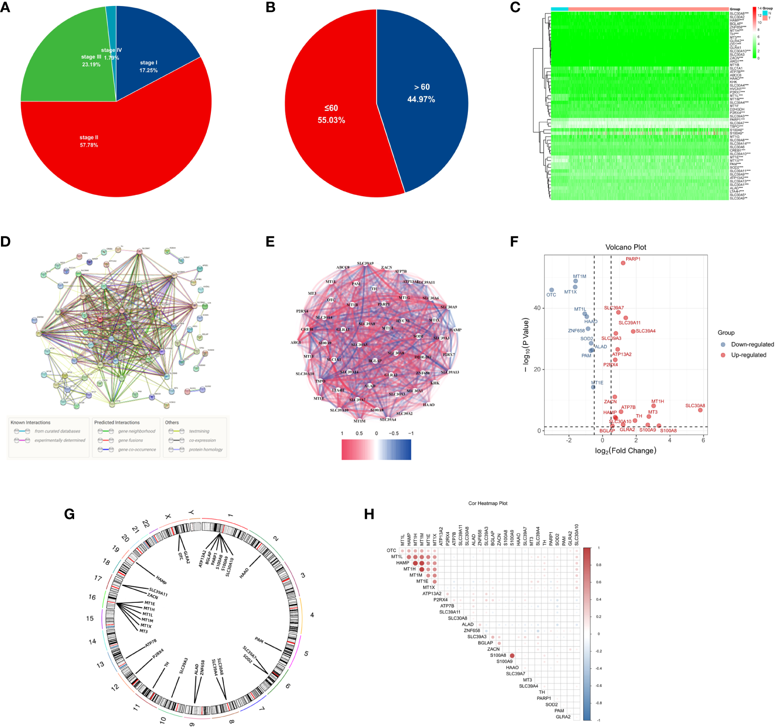 Expression and Genetic characteristics of ZMRGs in TCGA-BRCA cohort. (A) Age distribution in the TCGA-BRCA cohort. (B) Tumour stage distribution in the TCGA-BRCA cohort. (C) Heatmap of 76 differentially expressed ZMRGs. (D) PPI analysis among the 76 ZMRGs. (E) The correlation network of the ZMRGs. (F) Volcano plot illustration of differentially expressed ZMRGs in the TCGA-BRCA cohort. (G) The location of the ZMRGs on chromosomes. (H) Correlation matrix among the ZMRGs.