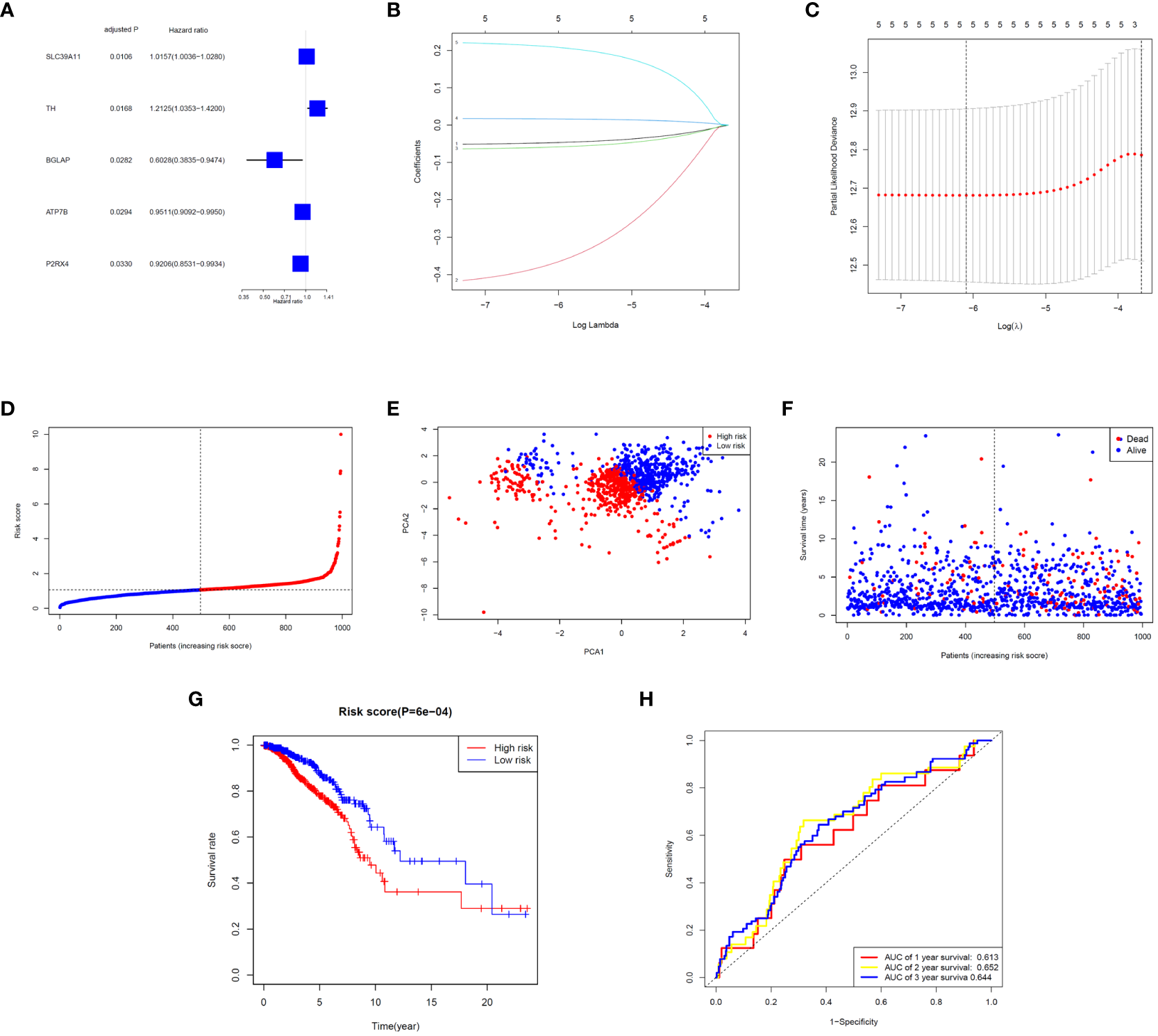 Correlation analysis between prognosis and characteristics of BC patients from the TCGA-BRCA database. (A) Univariate Cox regression of the five ZMRGs. (B) LASSO regression of the five ZMRGs. (C) Cross-validation in the LASSO regression. (D). The distribution of risk scores of the five ZMRGs. (E) The PCA plots based on risk scores. (F) The distribution of OS status of the five ZMRGs. (G) Kaplan–Meier survival curves for OS in the two risk groups. (H) AUC values of ROC curves for risk scores.