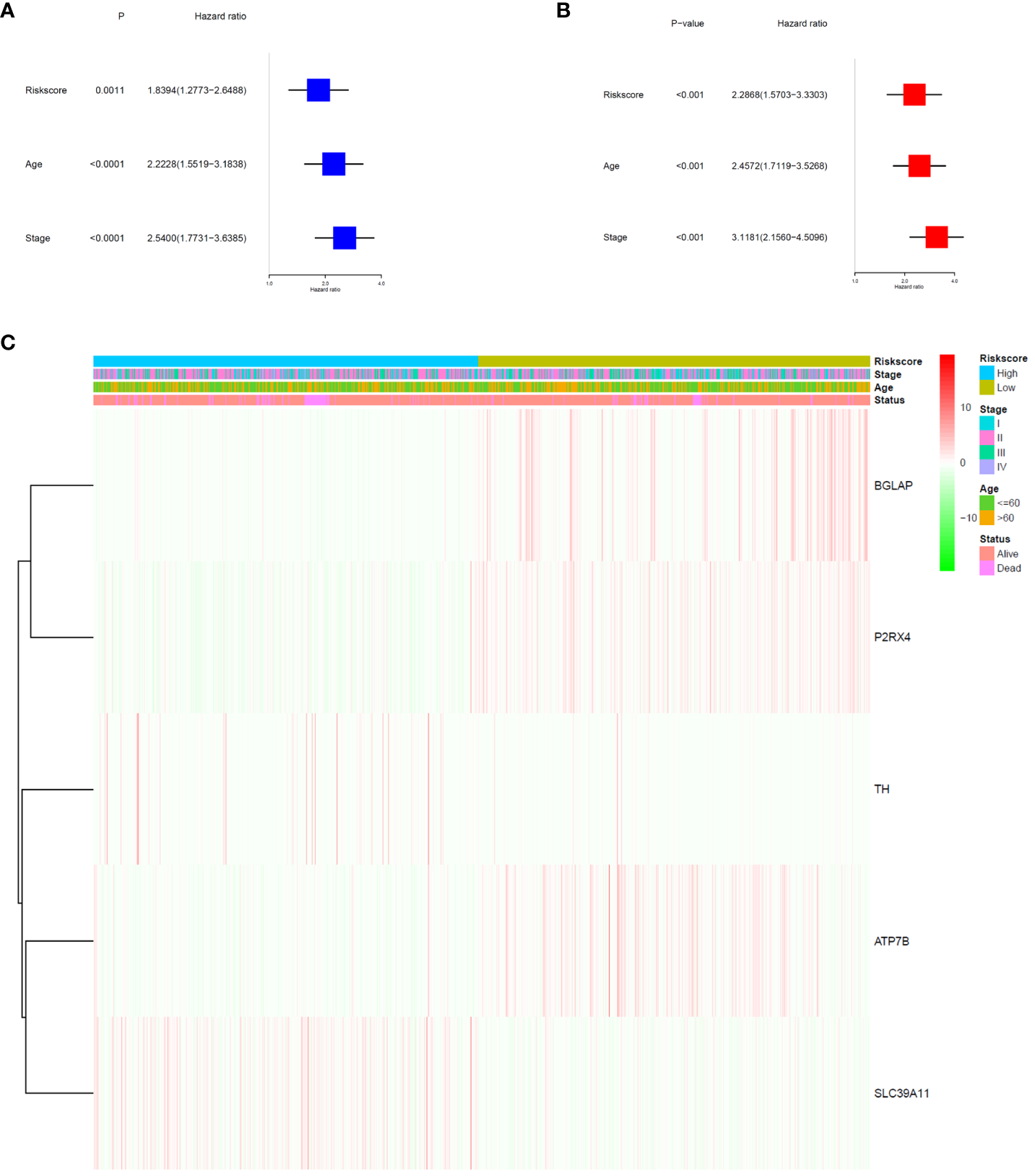 Prognostic value of the risk signature. (A) Univariate Cox analysis on OS for the risk score in TCGA-BRCA cohort. (B) Multivariate Cox regression on OS for the risk score in TCGA-BRCA cohort. (C) Heatmap of the association between clinical and pathological features in the two risk groups.