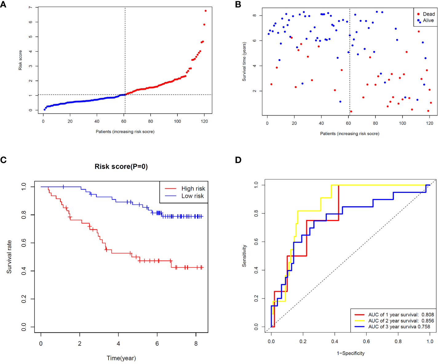 To validate the ability of the selected ZMRG signature to predict BC prognosis, we selected the external cohort GSE42568 (104 BC samples) from the GEO database. The risk model estimated risk scores for selected patients were calculated using the same formula and the same cut-off values were used to classify them as high- or low-risk patients (Figure 5A). Similar to the results obtained from the original TCGA cohort, patients in the high-risk group were more likely to die (Figure 5B). Survival analysis revealed significantly different survival rates between the two risk groups (Figure 5C). The AUCs were 0.808 and 0.758 for the ZMRGs at 1 and 3 years of follow-up, respectively, meaning we also achieved good predictive accuracy in the GEO cohort (Figure 5D).