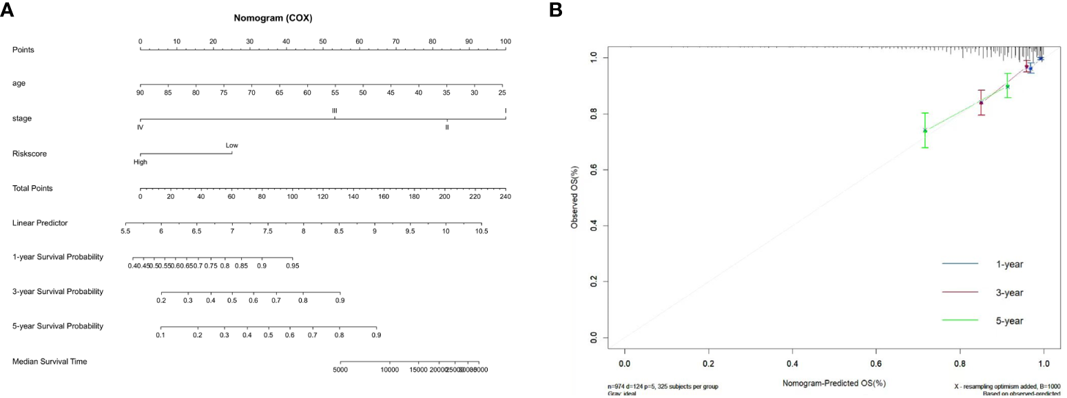 Development of the prognostic nomogram. (A) Nomogram based on the five ZMRGs comprising the signature and the clinical information. (B) The calibration plots for predicting 1-, 3-, and 5-year survival probabilities.