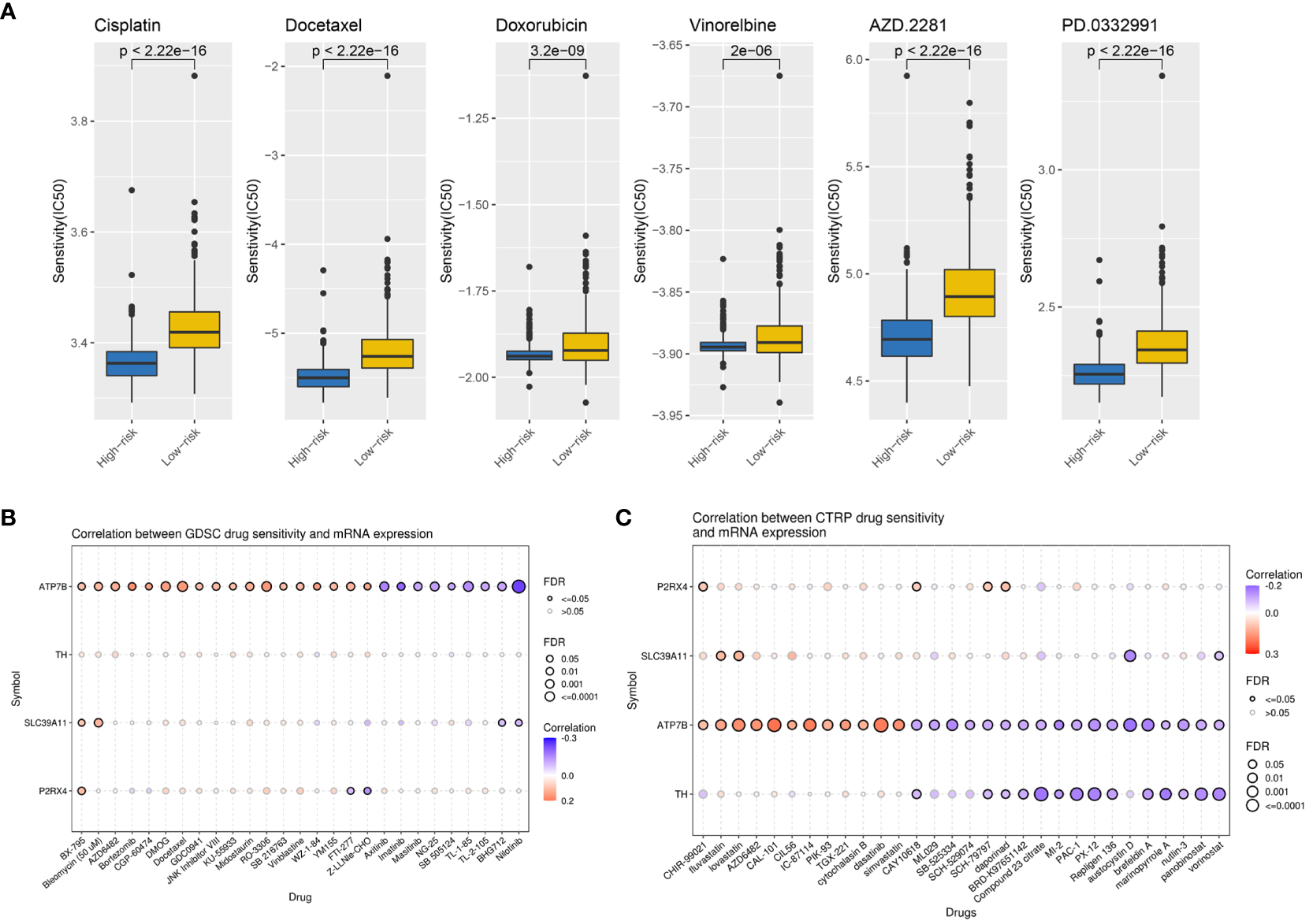 Potential therapeutic agents for BC based on ZMRG risk scores. (A) Comparison of IC50 values for commonly used drugs recommended in BC treatment guidelines in two risk groups. (B) Drug sensitivity analysis based on the GDSC database, drugs such as BX-795 and bleomycin may be therapeutically effective. (C) Drug sensitivity analysis based on the CTRP database, drugs such as CHIR-99021, fluvastatin, and lovastatin may be therapeutically effective. Positive correlations are represented by red bubbles and negative correlations by blue bubbles. The darker the colour of the bubbles the higher the correlation. The size of the bubbles is positively correlated with the significance of FDR. A black border on the bubbles indicates FDR ≤ 0.05.