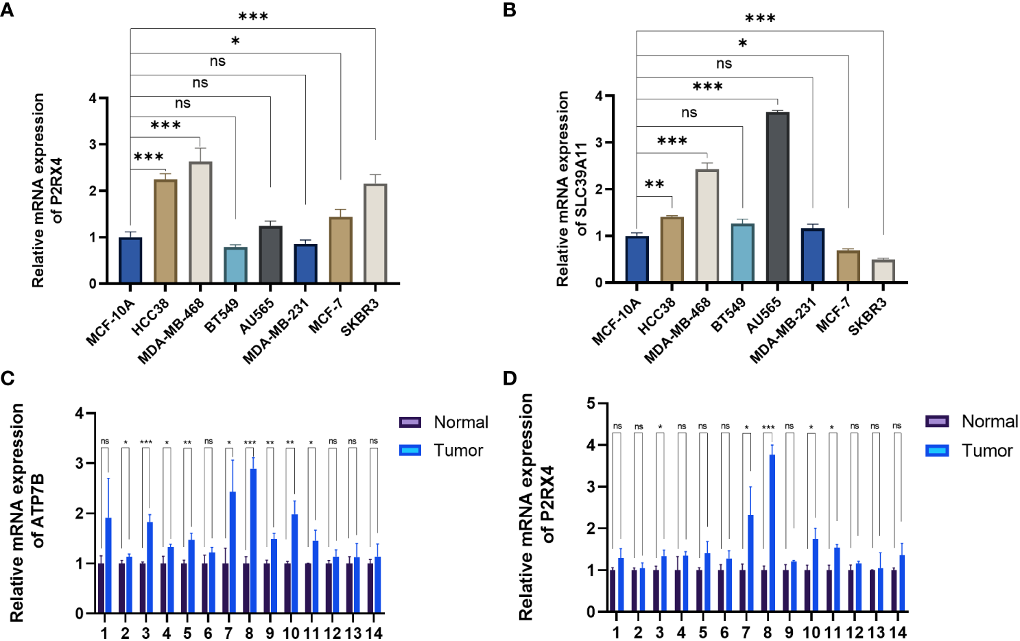 Validation of mRNA expression levels of the five ZMRGs. (A, B) The mRNA expression level of P2RX4 and SLC39A11in breast cancer cell line, as measured by qRT-PCR. (C, D) The mRNA expressions of ATP7B and P2RX4 in breast tissue as measured by qRT-PCR. *P < 0.05; **P < 0.01; ***P < 0.001; ns, no significance.