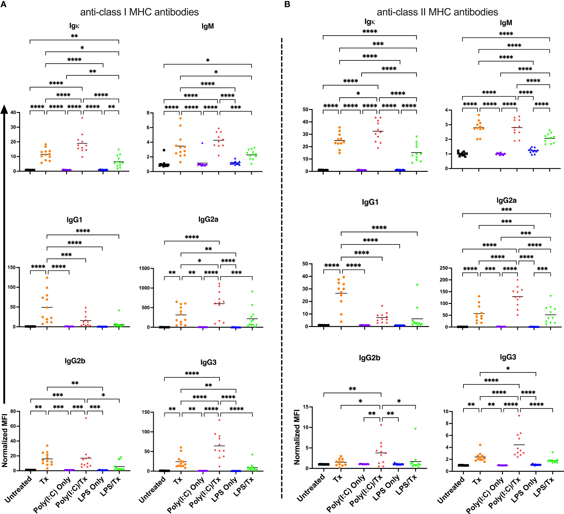 Poly(I:C) increases and LPS decreases the alloantibody response to non-leukoreduced platelet transfusion. (A) Total and isotype-specific anti-class I MHC antibody and (B) anti-class II MHC antibody responses at 14 days post non-leukoreduced platelet transfusion. For IgG1 for anti-class I MHC antibody (A), 100 was added to the raw values prior to normalization to adjust for negative values. Normalized MFI in mice that were untreated (