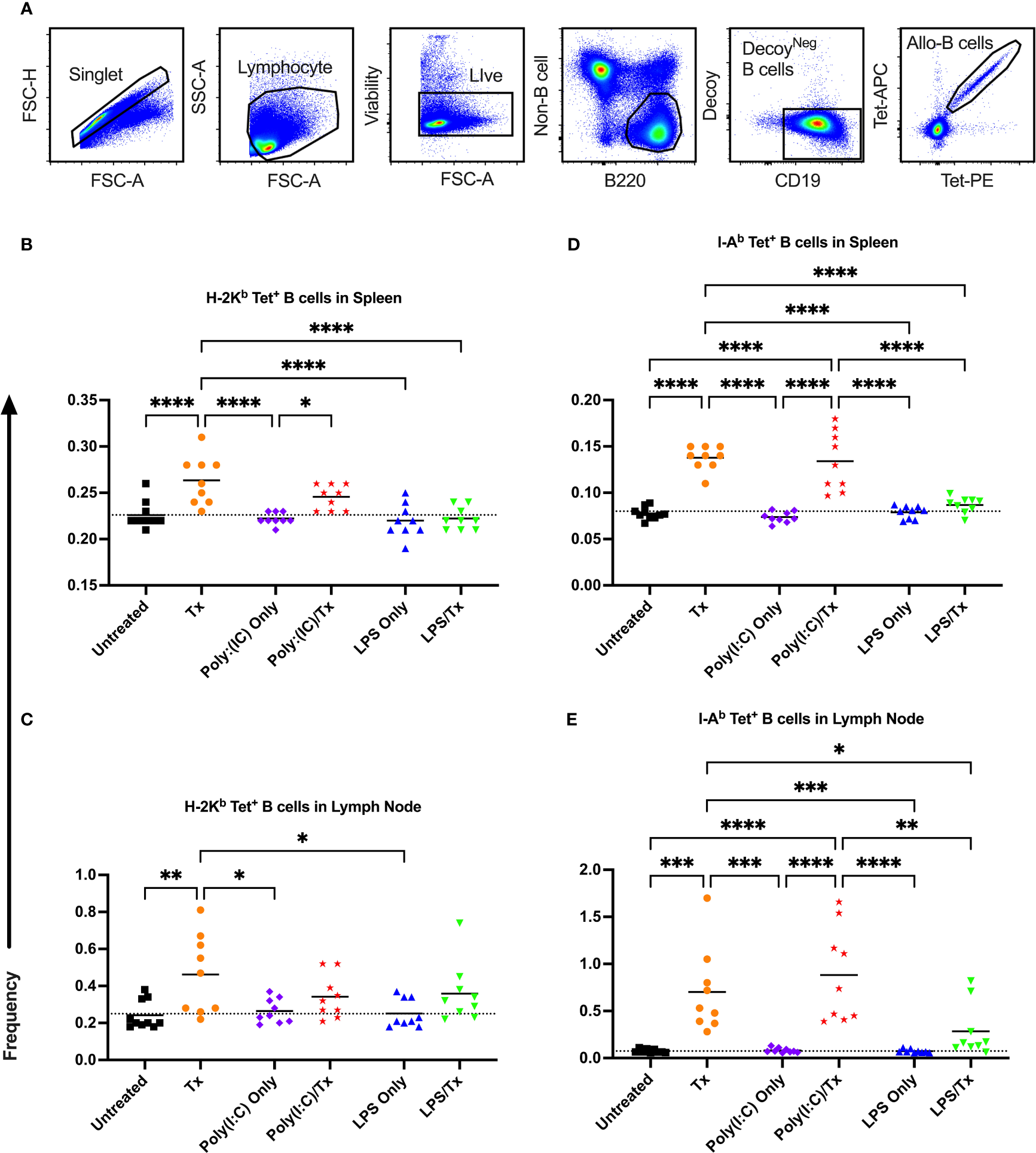 ). Splenic and lymph node cells were stained with MHC class I (B, C) and MHC class II (D, E) tetramers. Tick line represents mean of untreated group. (p)<0.05 (*), p<0.01 (**), p<0.001 (***), and p<0.0001 (****).
