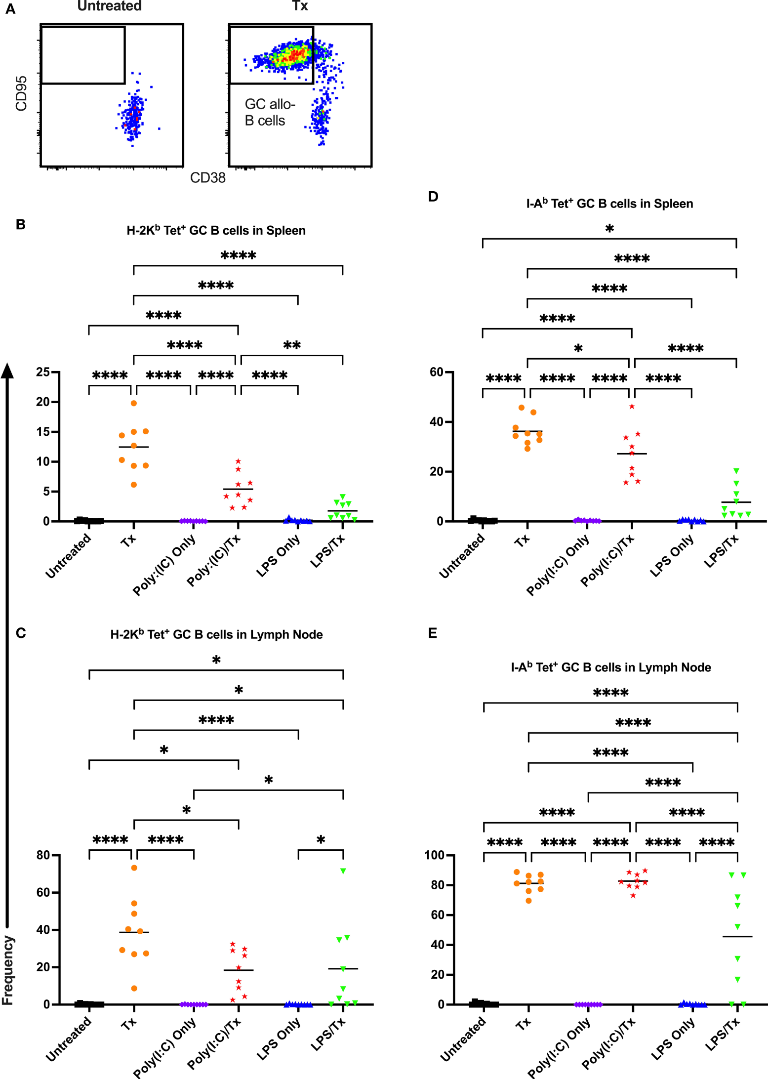 Germinal center response to transfusion is diminished with prior LPS exposure. (A) Frequency of germinal center (GC) CD95+/CD38- allo-B cells out of total allo-B cells was evaluated with representative examples shown of untreated and platelet transfused mice. (B–E) Shown is germinal center allo-B cell frequency in mice that were untreated (