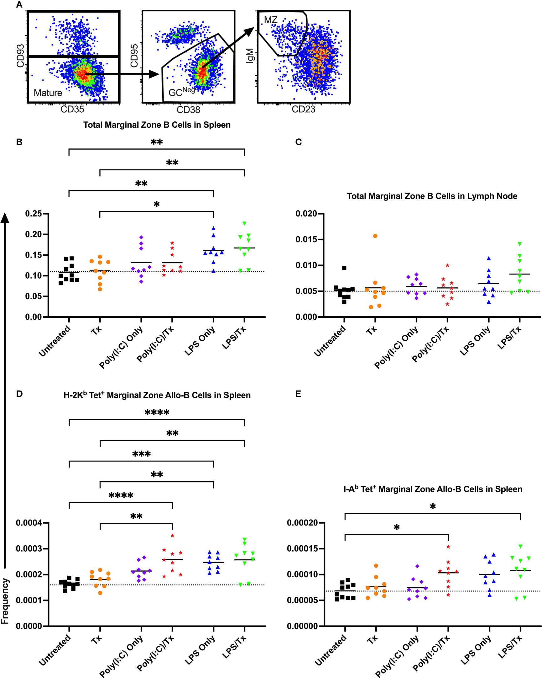 LPS non-specifically enriches for marginal zone B cells. (A) Representative gating selected for CD93- mature B cells, CD95-/CD38+ non-GC (GCNeg) B cells, and IgM+/CD23- marginal zone (MZ) B cells. Shown is frequency of total MZ B cells out of total B cells in spleen (B) and lymph node (C). Frequency of marginal zone B cells within the allo-B cell subset population out of total B cells is also shown in the spleen which were stained with MHC class I (D) and MHC class II (E) tetramers. Mice were untreated (