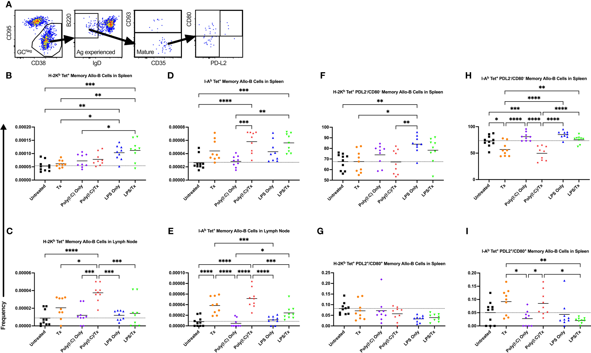 Underlying inflammation induced by poly(I:C) enriches for allo-B memory cells. (A) Gating strategy for allo-B memory cells selected for CD95-/CD38+ non-GC (GCNeg) B cells, B220+/IgD- antigen (Ag) experienced B cells, and CD93- mature B cells which represents total memory B cells. Total memory B cells were then selected for CD80-/PD-L2- double negative and CD80+/PD-L2+ double positive subsets of allo-B memory cells. (B–I) Shown is frequency out of total B cells. Splenic and lymph node cells were stained with MHC class I (B, C, F, G) and MHC class II (D, E, H, I) tetramers. (B–E) Frequency of total allo-B memory cells. Frequency of CD80-/PD-L2- double negative allo-B memory cells (F, H) and CD80+/PD-L2+ double positive allo-B memory cells (G, I). Mice were untreated (