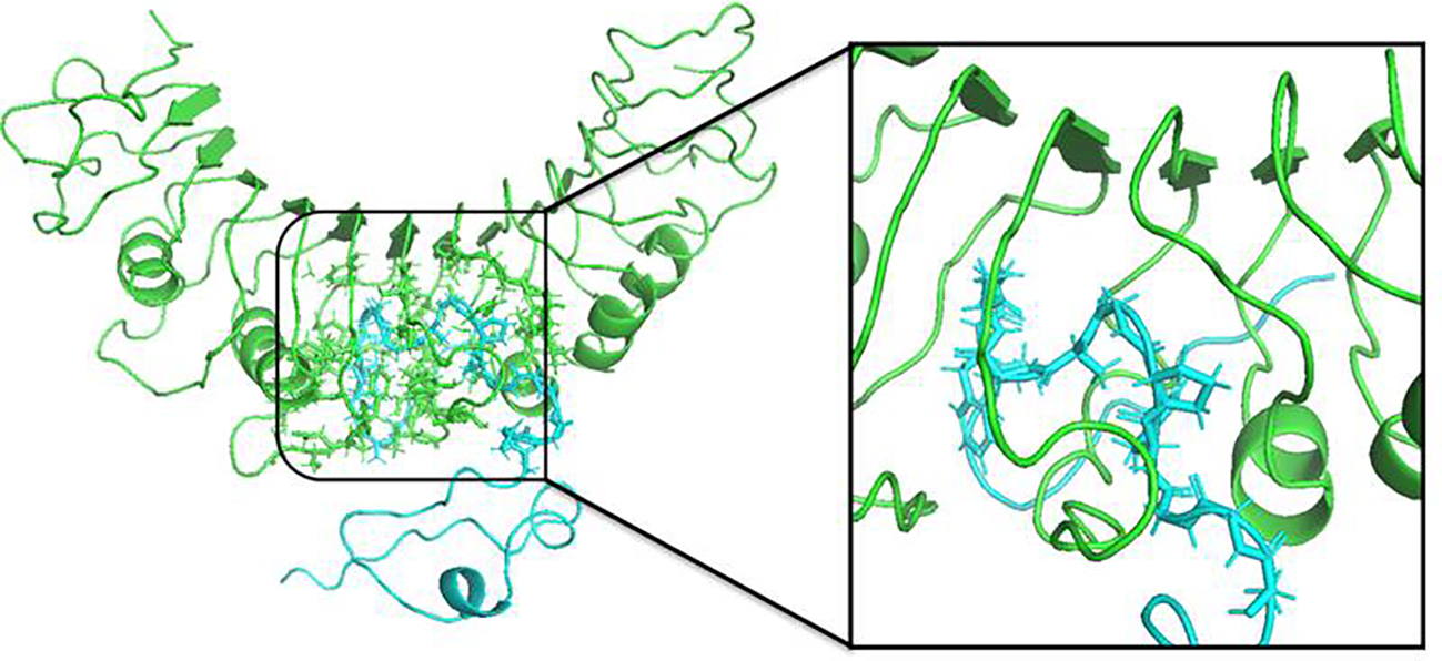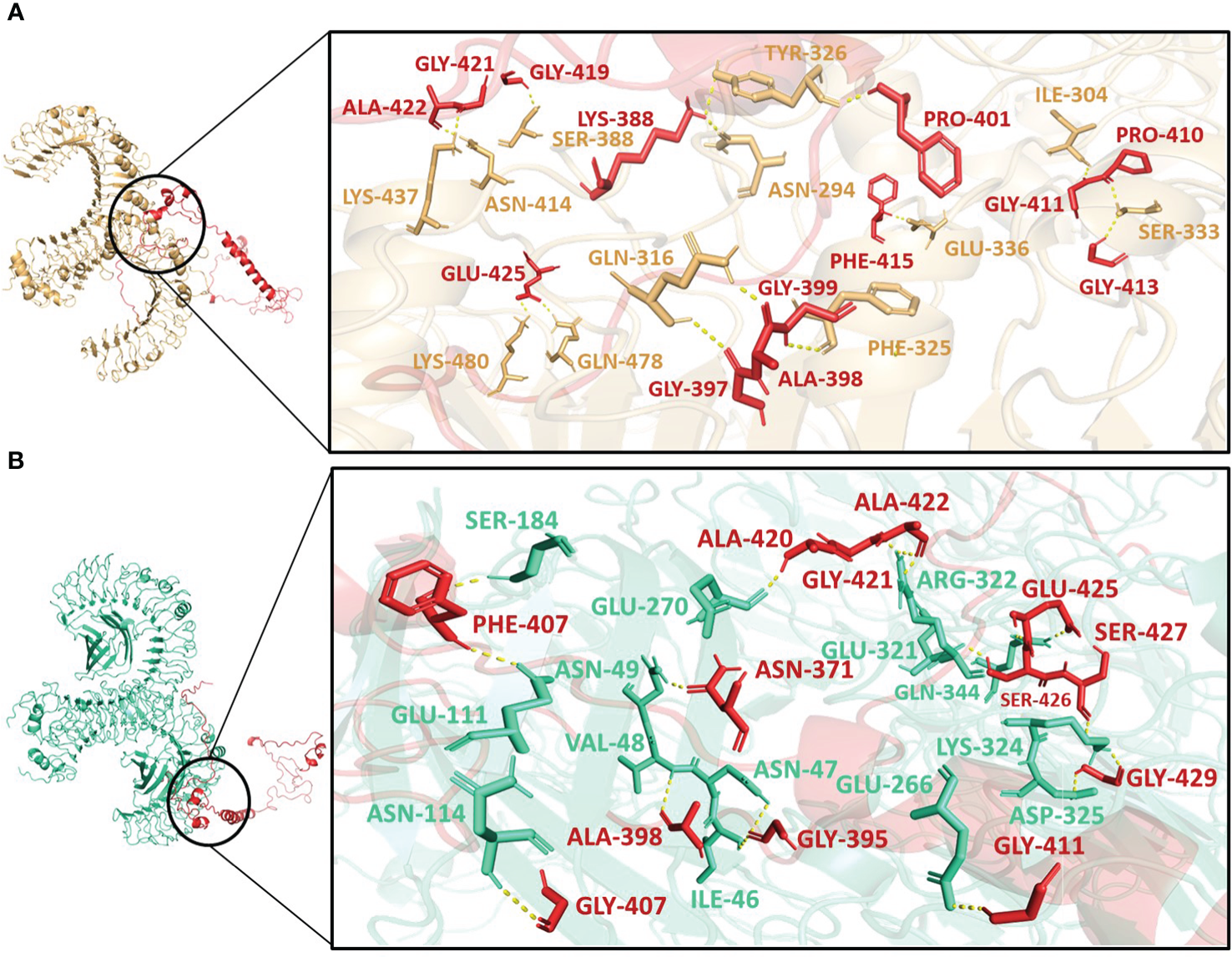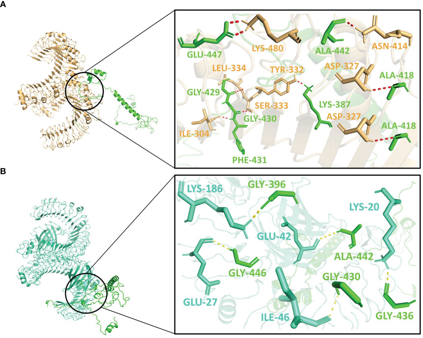 Interactions of the vaccine V1 (red) with (A) TLR2 (light-orange) and (B) TLR4 (green-cyan).