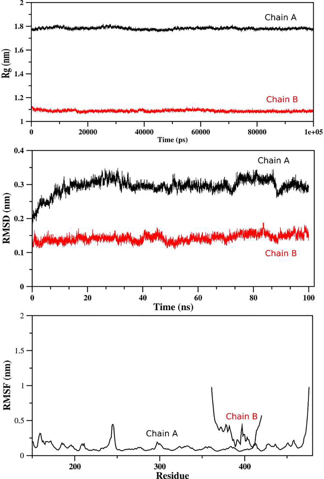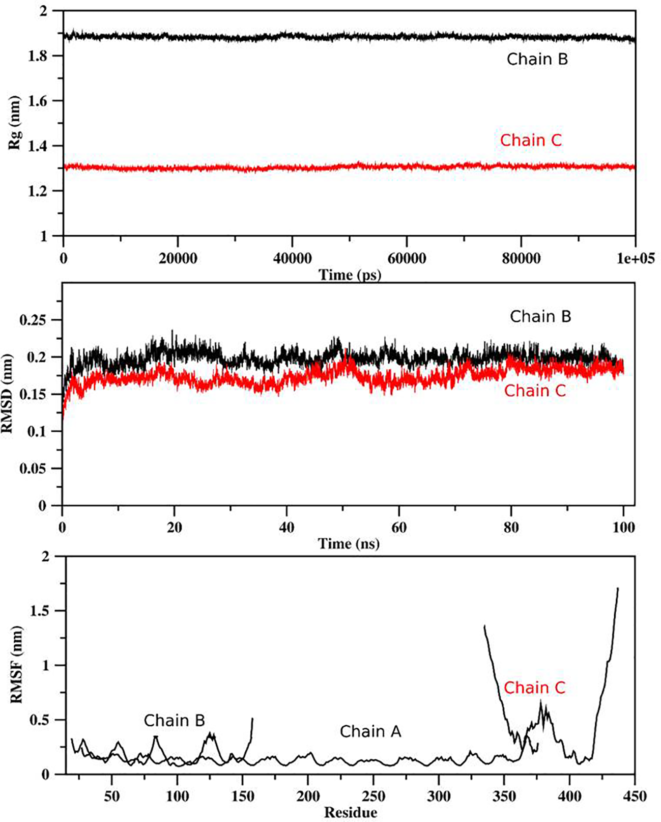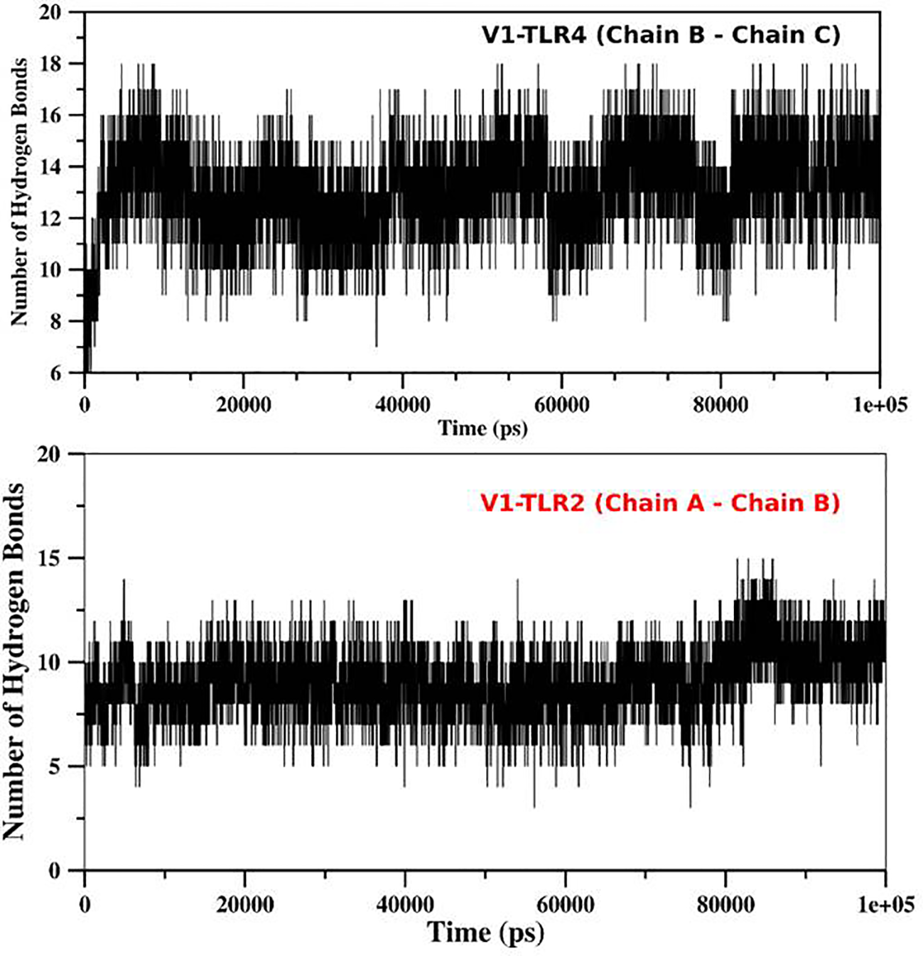 The V1-Receptor complexes were subjected to Molecular Dynamic Simulations for determining the complex stability. The TLR2 & TLR4 as receptors and the vaccine V1 as ligand were prepared as per the standard protocol of GROMACS as performed in our recent study (23). The constructed complexes were subjected to production run of 100 ns and results were analyzed using vmd and in house scripts.