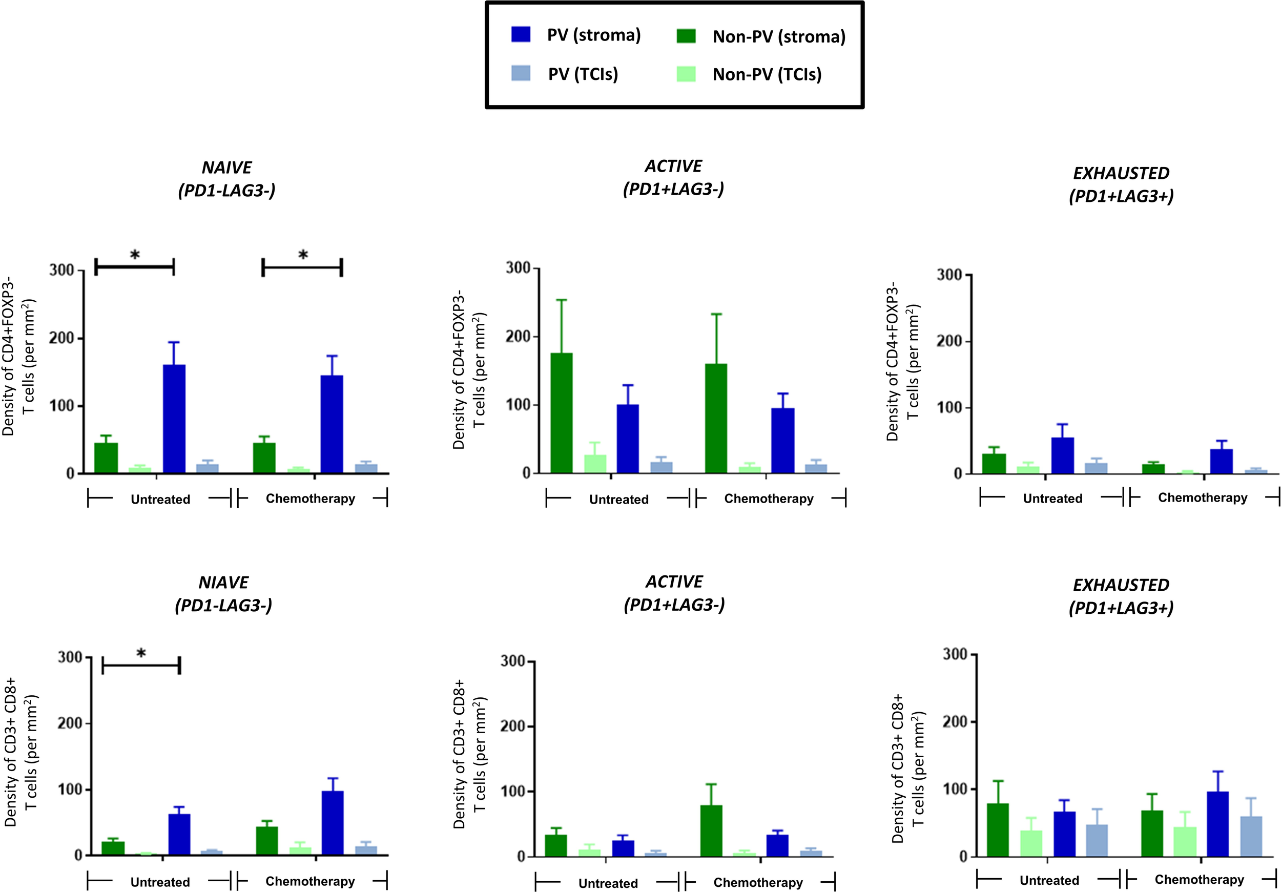 The activation status of CD4+ and CD8+ T cells was assessed using antibodies to the activation marker, PD-1, and exhaustion marker, LAG-3 (ie. naïve T cells are PD1-LAG3-; active T cells are PD1+LAG3-; exhausted T cells are PD1+LAG3+). Figure 6 shows that only naïve CD4+ (top row) and CD8+ T cells (bottom row) preferentially located to PV areas of the stroma in untreated tumors. This persisted in NAC tumors for CD4+ T cells. By contrast, both active and exhausted CD4+ and CD8+ T cells were evenly distributed across tumors (although active subsets of both CD4+ and CD8+ T cells showed a non-significant trend towards a more stromal distribution). Exhausted CD4+ T cells were only present at low density in all areas whereas exhausted CD8+ T cells showed greater variation between tumors with some containing a similar density in the stroma to naïve CD8+ T cells. Taken together, these data suggest that PV areas of tumors contain mainly naïve and active CD4+ T cells, and naïve and exhausted CD8+ T cells.
