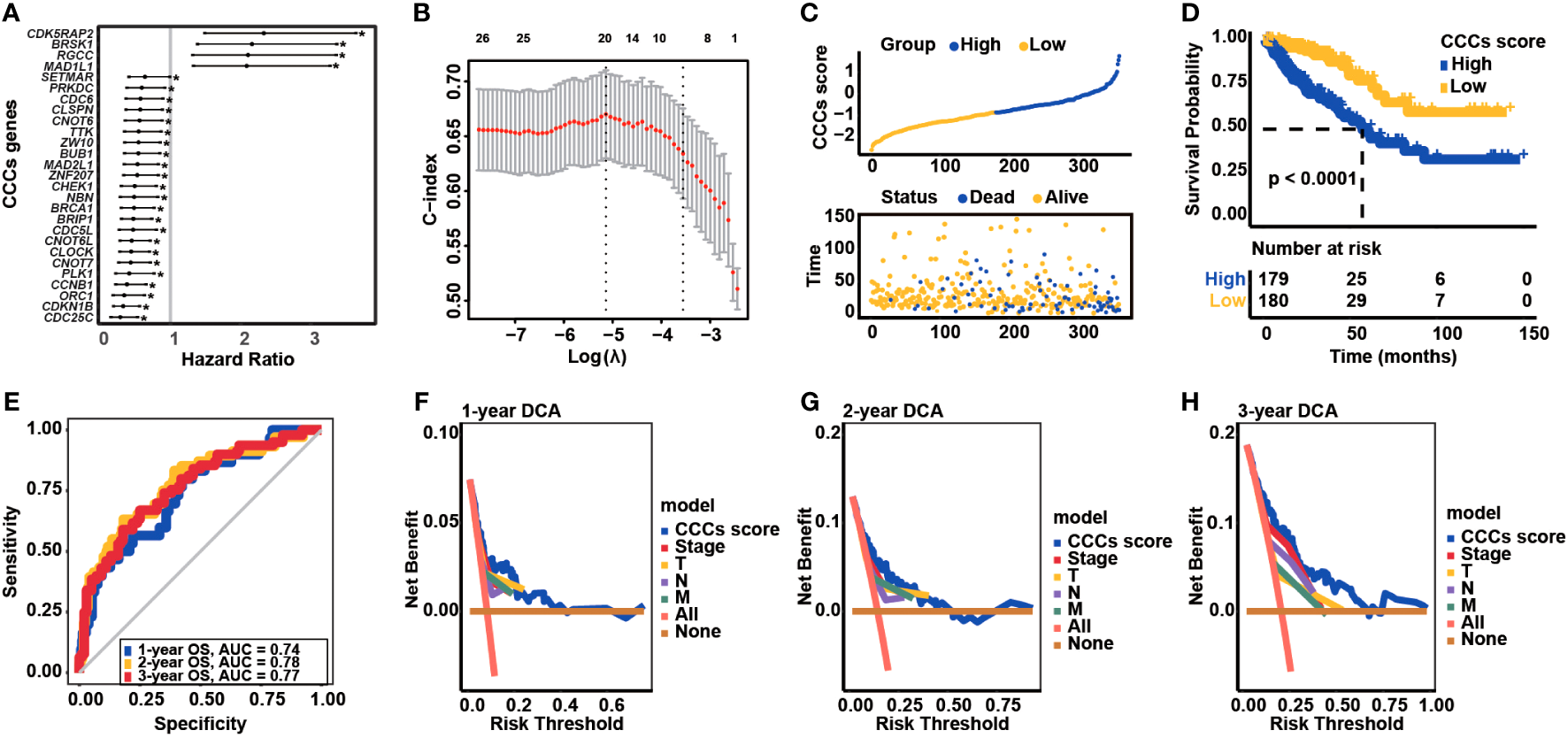 Transcriptomic correlates of cell cycle checkpoints (CCCs) with the overall survival (OS) of colorectal carcinoma (COAD) and construction of a novel CCC signature. (A) The univariate Cox regression analysis identified the OS-related CCCs in COAD. (B) The least absolute shrinkage and selection operator (LASSO) Cox regression analysis for the construction of a novel CCC signature. (C) COAD patients from TCGA COAD cohort were divided into the high and low CCC score groups. (D) The Kaplan–Meier curve analysis revealed the differential OS between high and low CCC score groups. (E) The receiver operating characteristic curve analysis. The decision curve analyses (DCA) of CCC signature in predicting 1-year (F), 2-year (G), and 3-year (H) OS for COAD patients.