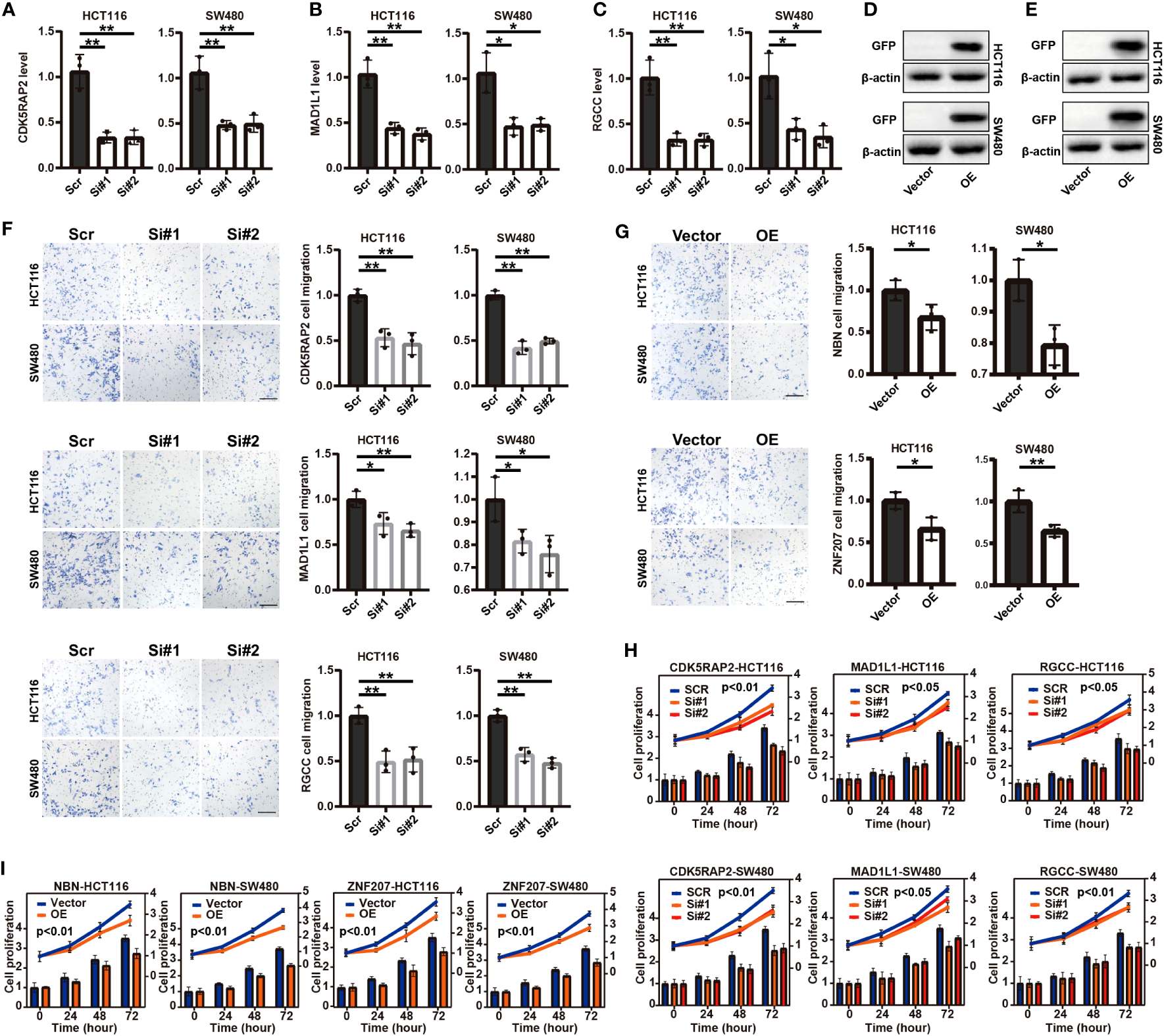 Transwell assay analysis and cell proliferation analysis of five screened (functional role was unknown in COAD) cell cycle checkpoints (CCC) signature-related genes in the COAD-derived cell lines. The qRT-PCR analysis for the verification of the RNA interference by siRNA targeting CDK5RAP2(A), MAD1L1(B), and RGCC(C) in the HCT116 and SW480 cell lines. The construction of NBN- (D) and ZNF207-overexpressed (E) pCMV plasmid systems in the HCT116 and SW480 cell lines. The Transwell assay analysis demonstrated the effects of the suppressed expression of CDK5RAP2, MAD1L1, and RGCC(F) and NBN and ZNF207 overexpression (G) on the cell migration of the HCT116 and SW480 cell lines. The effects of the suppressed expression of CDK5RAP2, MAD1L1, and RGCC(H) and NBN and ZNF207 overexpression (I) on the cell proliferation of HCT116 and SW480 cell lines. *, p<0.05; **, p<0.01.