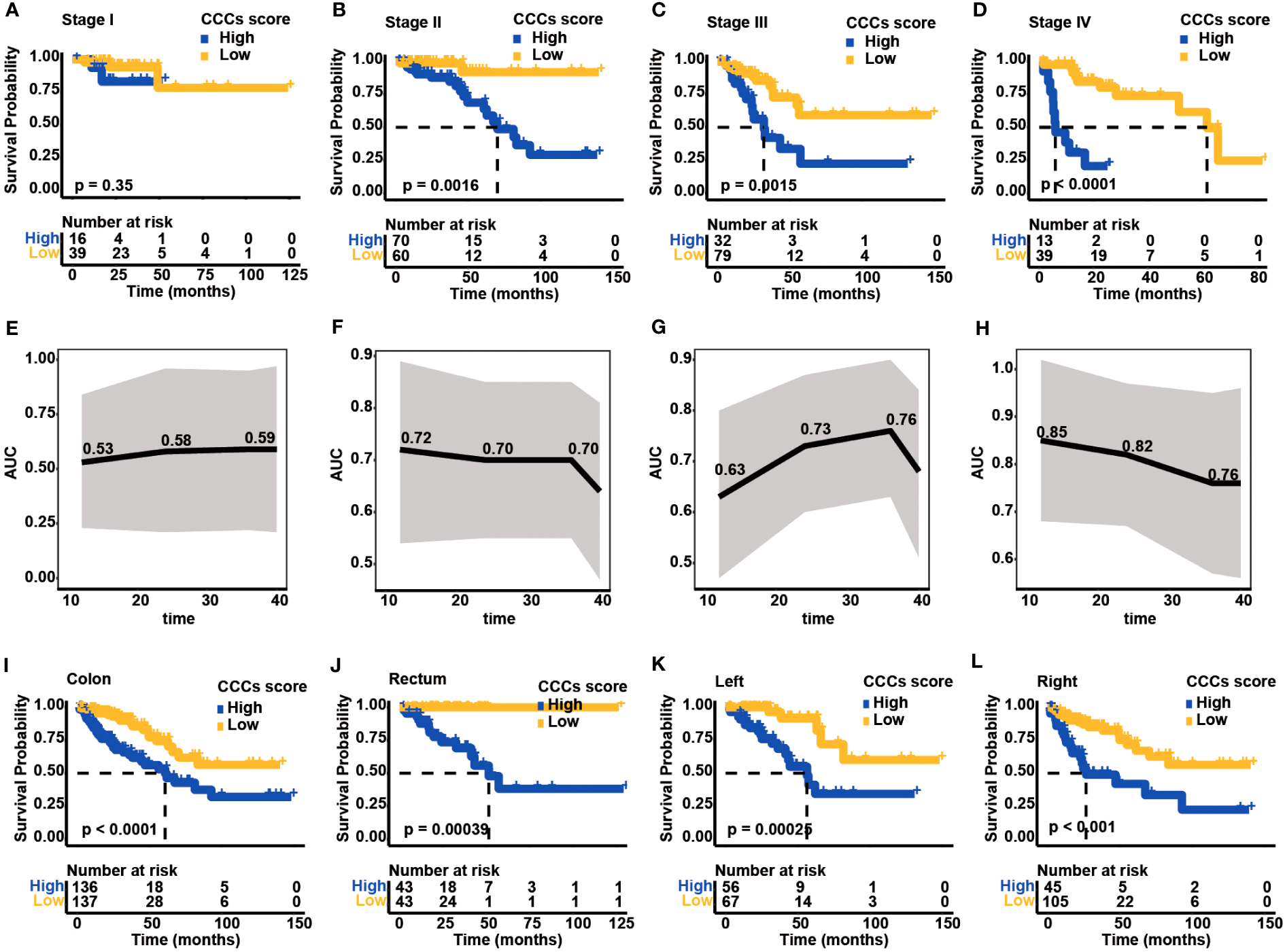 Clinical application of cell cycle checkpoint (CCC) signature. Based on the optimal cutoff value of the CCC score, the Kaplan–Meier curve analysis of the high and low CCC score groups among colorectal carcinoma (COAD) patients in clinical stages I (A), II (B), III (C), and IV (D). The receiver operating characteristic curve analysis of CCC signature in predicting prognosis for COAD patients in clinical stages I (E), II (F), III (G), and IV (H). The application of the CCC signature among patients with colon cancer (I) or rectum cancer (J). Regarding colon cancer patients, the Kaplan-Meier curve analysis between the high and low CCC score groups among patients with left-side (K) or right-side (L) colon cancer.