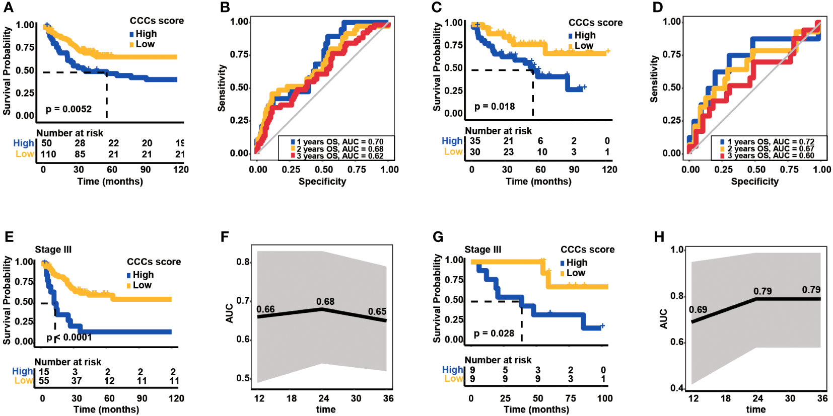 The prognostic value of the CCC signature in different UICC/AJCC clinical stages was further investigated. Except for COAD patients in clinical stage I (median OS in the high CCC score group vs. low CCC score group: unreached vs. unreached, p = 0.35, Figure 5A), in clinical stages II, III, and IV patients in high CCC score group had worse OS (median OS in stage II: 70.16 months vs. unreached, p = 0.0016; in stage III: 31.96 months vs. unreached, p = 0.0015; in stage IV: 5.88 months vs. 61.84 months, p< 0.0001, Figures 5B–D). In parallel, the above results suggested that the prognostic value of the CCC signature was more robust for patients with advanced stages, and it was further validated by the ROC curve analysis (Figures 5E–H). It was revealed that CCC signature had good prognosis prediction for COAD patients in clinical stage II (AUC at 1, 2, and 3 years were 0.72, 0.70, and 0.70, respectively, Figure 5F), as well as for patients in clinical stage III (AUC at 1, 2, and 3 years were 0.63, 0.73, and 0.76, respectively, Figure 5G). Of note, CCC signature had the best prognosis prediction for COAD patients in clinical stage IV, with the AUC values for OS at 1, 2, and 3 years were 0.85, 0.82, and 0.76, respectively (Figure 5H).