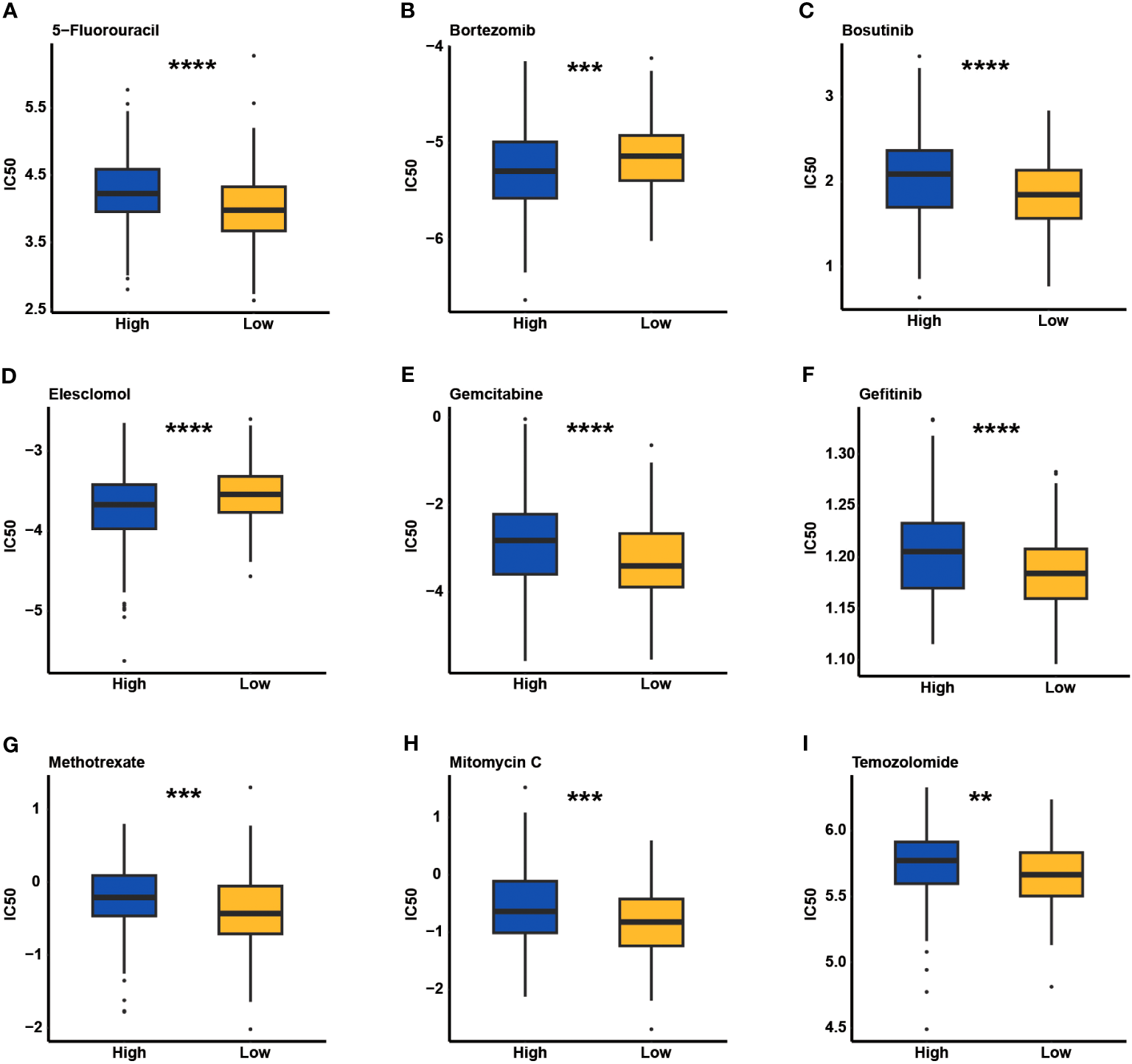 Initially, the GSE153412 dataset about the therapeutic response evaluation of COAD cancer cell lines (HCT116 and HT29) and the GSE196263 dataset of CMS4 subtype colon cancer patients receiving imatinib treatment were downloaded to explore the potential predictive role of CCC score in the therapeutic response for COAD patients. Moreover, the GSE173839 (HER2-negative stage II/III breast cancer patients on the durvalumab with olaparib and paclitaxel arm: 29 responders vs. 42 nonresponders), GSE25066 (breast cancer patients treated with taxane-anthracycline chemotherapy: 99 patients with pathological complete response (pCR) vs. 389 patients with residual disease (RD)), and GSE41998 (early-stage breast cancer patients receiving neoadjuvant cyclophosphamide/doxorubicin with ixabepilone or paclitaxel: 69 responders vs. 184 responders) datasets were also downloaded to further evaluate the predictive ability of the CCC signature in the therapeutic response. The dataset GSE194040 (the I-SPY2-990 mRNA/RPPA Data Resource) contained gene expression and clinical data for 987 patients from 10 arms of the neoadjuvant I-SPY2 TRIAL for aggressive early-stage breast cancer. The GSE48276 dataset included 128 muscle-invasive bladder cancer patients receiving frontline chemotherapy. In addition, the Genomics of Drug Sensitivity in Cancer (GDSC, https://www.cancerrxgene.org/) database was usually employed to predict chemotherapeutic response; therefore, the GDSC database was further utilized by the “pRRophetic” package. The value of half maximal inhibitory concentration (IC50) was used to assess the chemotherapeutic response.