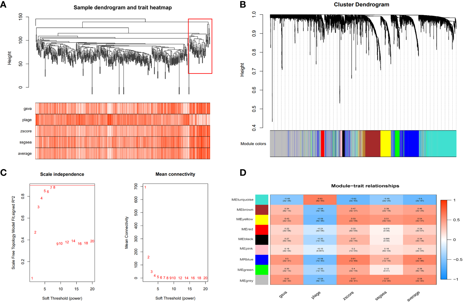 Figure 5 Weighted gene co-expression network analysis (WGCNA). (A) The cluster dendrogram of co-expression genes in HCC. The red boxes are dendrogram regions corresponding to disulfidptosis. (B) Cluster analysis of HCC samples to detect outliers (the white-to-red linear gradient color is associated with the disulfidptosis score, and the grey color indicates missing data). (C) Determination of soft-thresholding power in the WGCNA. (D) Module–trait relationships in HCC. Each cell contains the corresponding correlation and P-value.