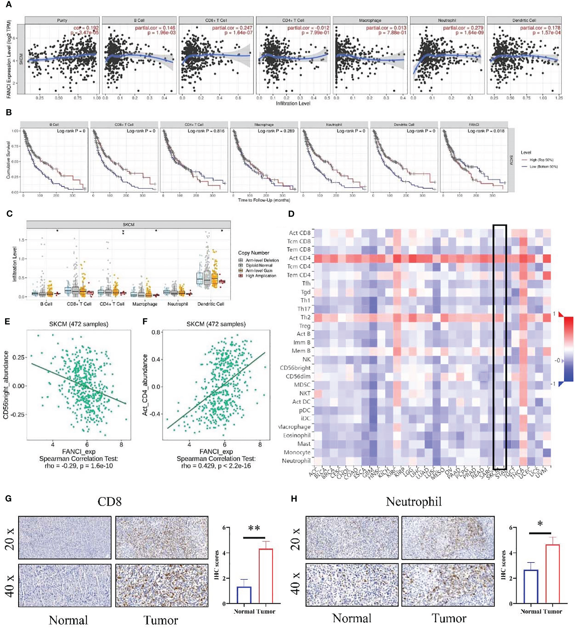 The relationship between the level of FANCI and immune infiltration from SKCM. (A) FANCI was correlated with immune cell infiltration in SKCM. (B) K-M plots in SKCM. (C) The correlation of SCNA of FANCI and immune infiltration. (D) The correlation between FANCI and 28 immune cells from the TISIDB database. (E) FANCI was negatively correlated with CD56bright cells. (F) FANCI was positively correlated with neutrophils. (G) IHC detected the difference expression of CD8 between normal and tumor tissues. (H) The difference of neutrophil between normal and tumor tissues was determined by IHC. *P < 0.05, **P < 0.01.