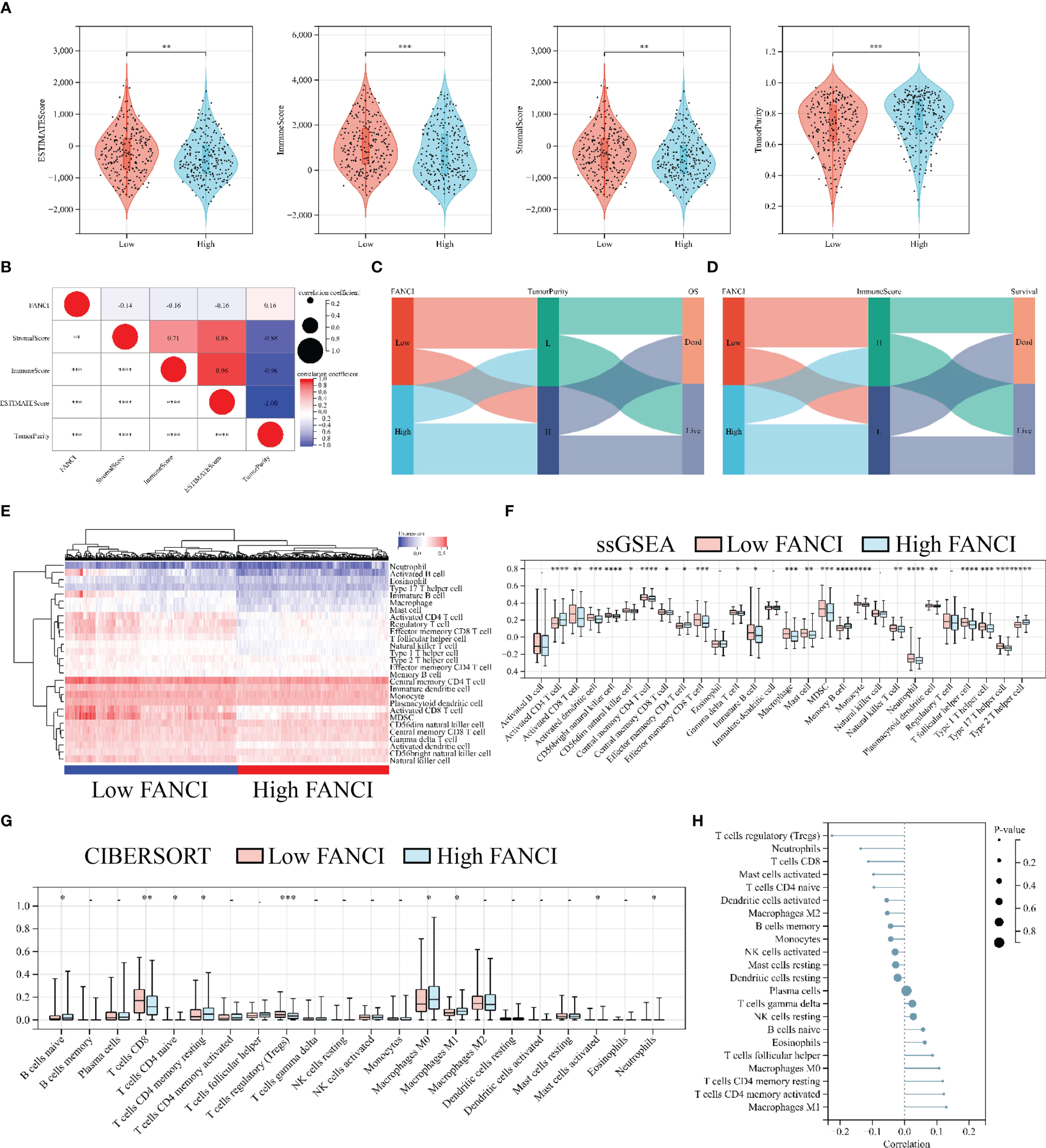 High FANCI expression suppresses immune infiltration. (A) The expression of ESTIMATEScore, ImmuneScore, StromalScore, and TuomrPurity between the higher and the lower FANCI groups. (B) The correlation of FANCI and ESTIMATEScore, ImmuneScore, StromalScore, and TuomrPurity. (C) The Sankey diagram illustrates the correlation between FANCI, TuomrPurity, and survival status. (D) The Sankey diagram illustrates the correlation between FANCI, ImmuneScore, and survival status. (E) The heatmap displays the expression of 28 TIICs in each patient in TCGA-SKCM. (F) The expression of 28 TIICs between the higher and the lower FANCI groups. (G) The expression of 22 immune cells between the higher and the lower FANCI groups. (H) The correlation of FANCI and 22 immune cells. *P < 0.05, **P < 0.01, ***P < 0.001, ****P < 0.0001.