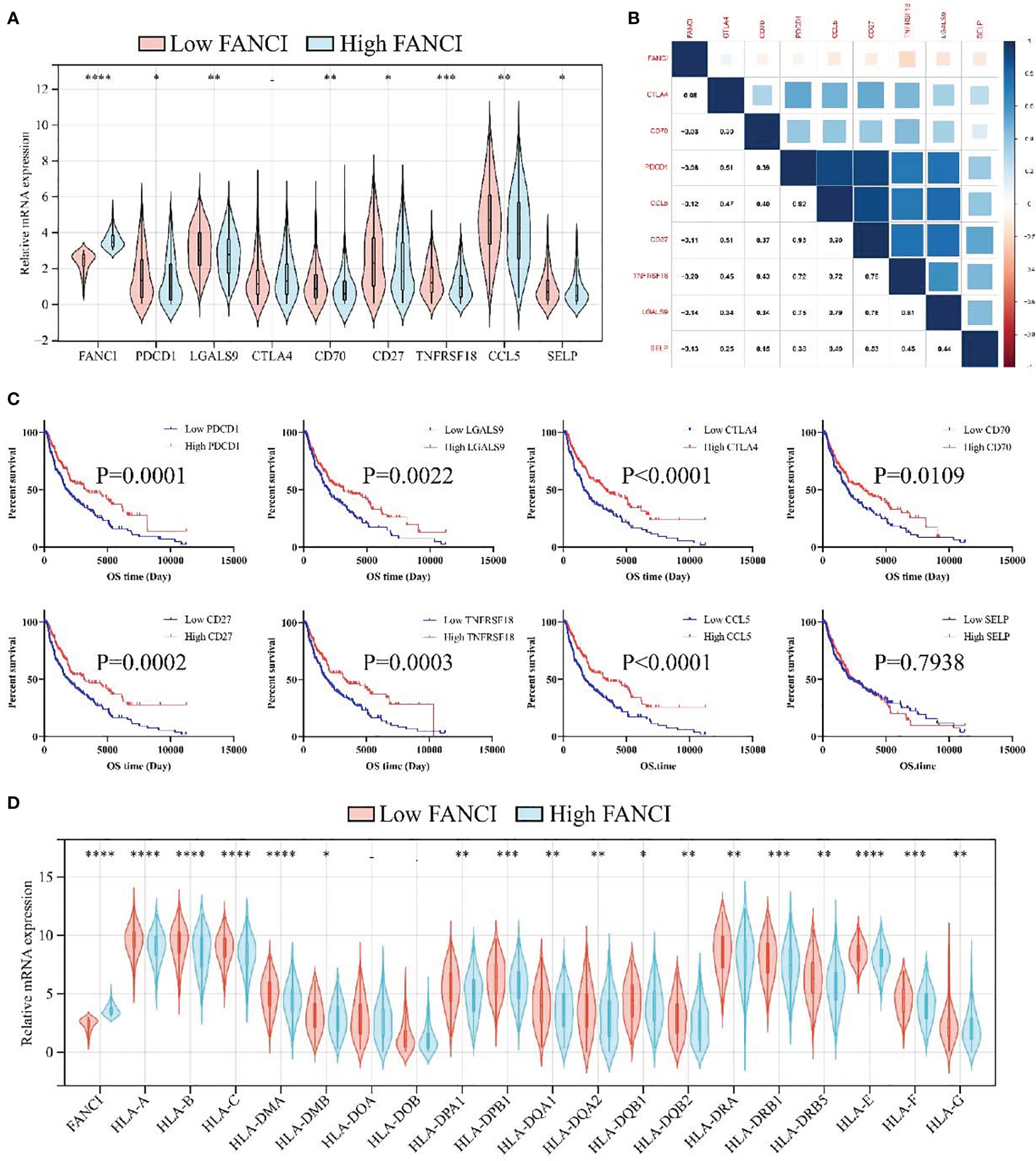 The study examined the expression of eight classic immune checkpoint genes (PDCD1, LGALS9, cytotoxic T lymphocyte (CTL)A4, CD70, CD27, TNFRSF18, CCL5, and SELP) in different FANCI groups to investigate the sensitivity of patients in the high and low FANCI groups to immunotherapy. The study obtained the correlation between FANCI and immune checkpoint genes through the Spearman algorithm. We used the median gene expression of immune checkpoint genes as a cut-off value to investigate the relationship between immune checkpoint genes and OS in SKCM.
