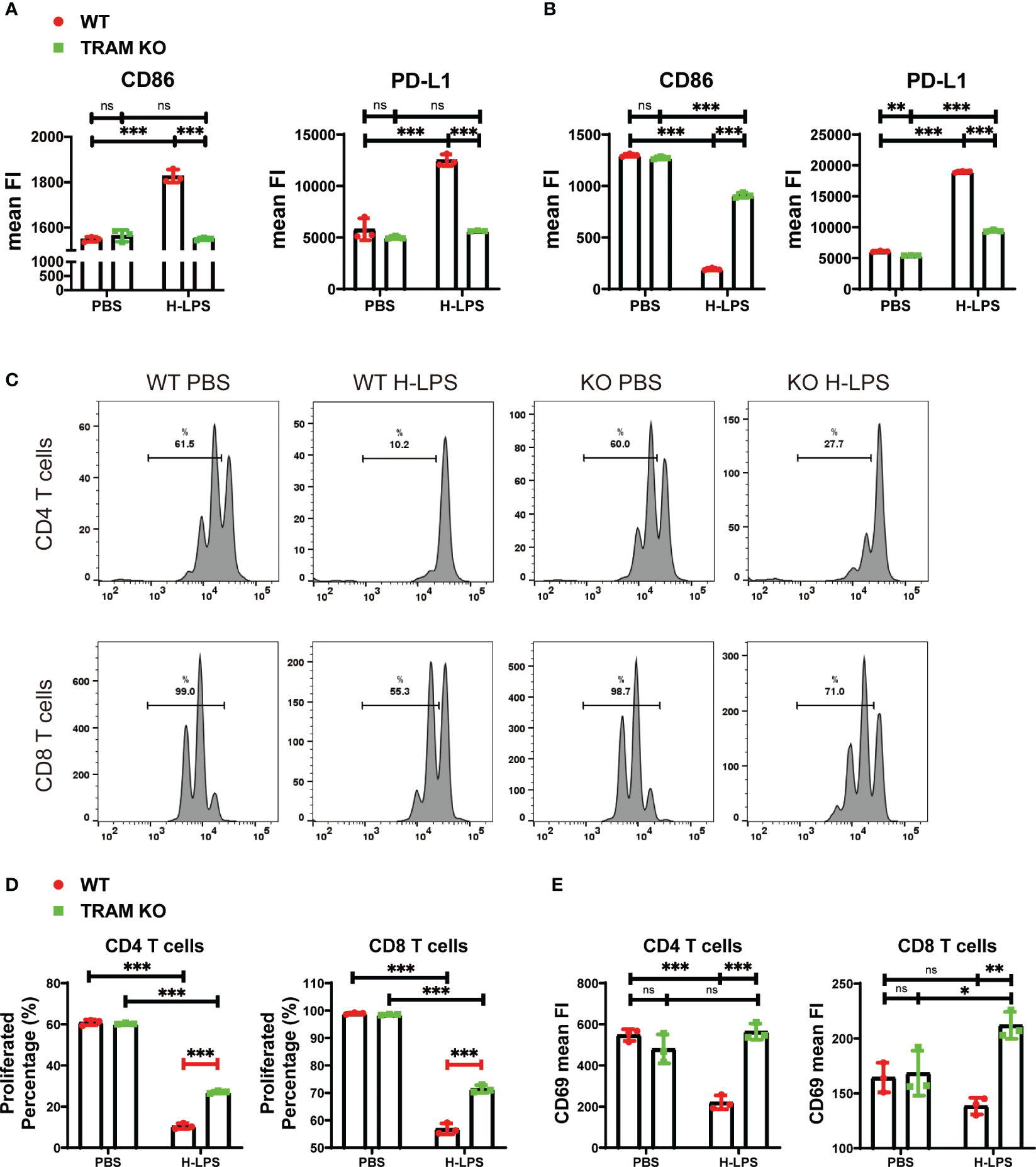 The generation of sustained monocyte exhaustion requires TRAM adaptor signaling. (A, B) BMDMs from WT and TRAM KO mice were stimulated with either PBS or H-LPS (100 ng/mL) for 5 hours or 5 days. The mean FIs of CD86 and PD-L1 in WT and TRAM KO monocytes on 5 hours (A) or 5 days (B) were analyzed with flow cytometry. The relative changes in mean FIs of CD86 and PD-L1 comparing LPS vs PBS-treated monocytes were determined and plotted in the graphs. (C–E) Splenic T cells were cocultured with 5-day PBS or H-LPS treated WT or TRAM KO monocytes for 2 days. CFSE prelabeled recipient T cells were stained for CD4, CD8, and CD69 and analyzed by flow cytometry at day 2. The representative CFSE histogram of CD4+ and CD8+ T cells were shown in (C). The quantification of CD4+ and CD8+ T cells proliferation percentage were shown in (D). Both CD4+ and CD8+ T cells were divided more than 3 times after coculture with PBS treated WT or TRAM KO monocytes. (E) The CD69 expressions of CD4+ and CD8+ T cells after 2-day coculture were analyzed with flow cytometry. The data are representative of at least three independent experiments, and error bars represent means ± SD. ns, not significant, *p<0.05, **p<0.01, ***p<0.001.