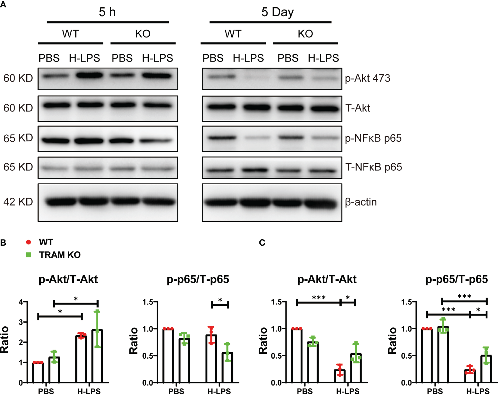 TRAM is involved for the sustained suppression of Akt and NFκB p65 in exhausted monocytes leading to reduced expression of CD86. BMDMs from WT and TRAM KO mice were stimulated with either PBS or H-LPS (100 ng/mL) for 5 hours or 5 days. (A) The levels of phosphorylated Akt, total Akt, phosphorylated NFκB p65 and total NFκB p65 were determined by western blot. (B, C) The relative levels of p-Akt (B) and p-NFκB p65 (C) were normalized to T-Akt and T-NFκB p65 separately. Error bars represent means ± SD. *p<0.05, ***p<0.001.
