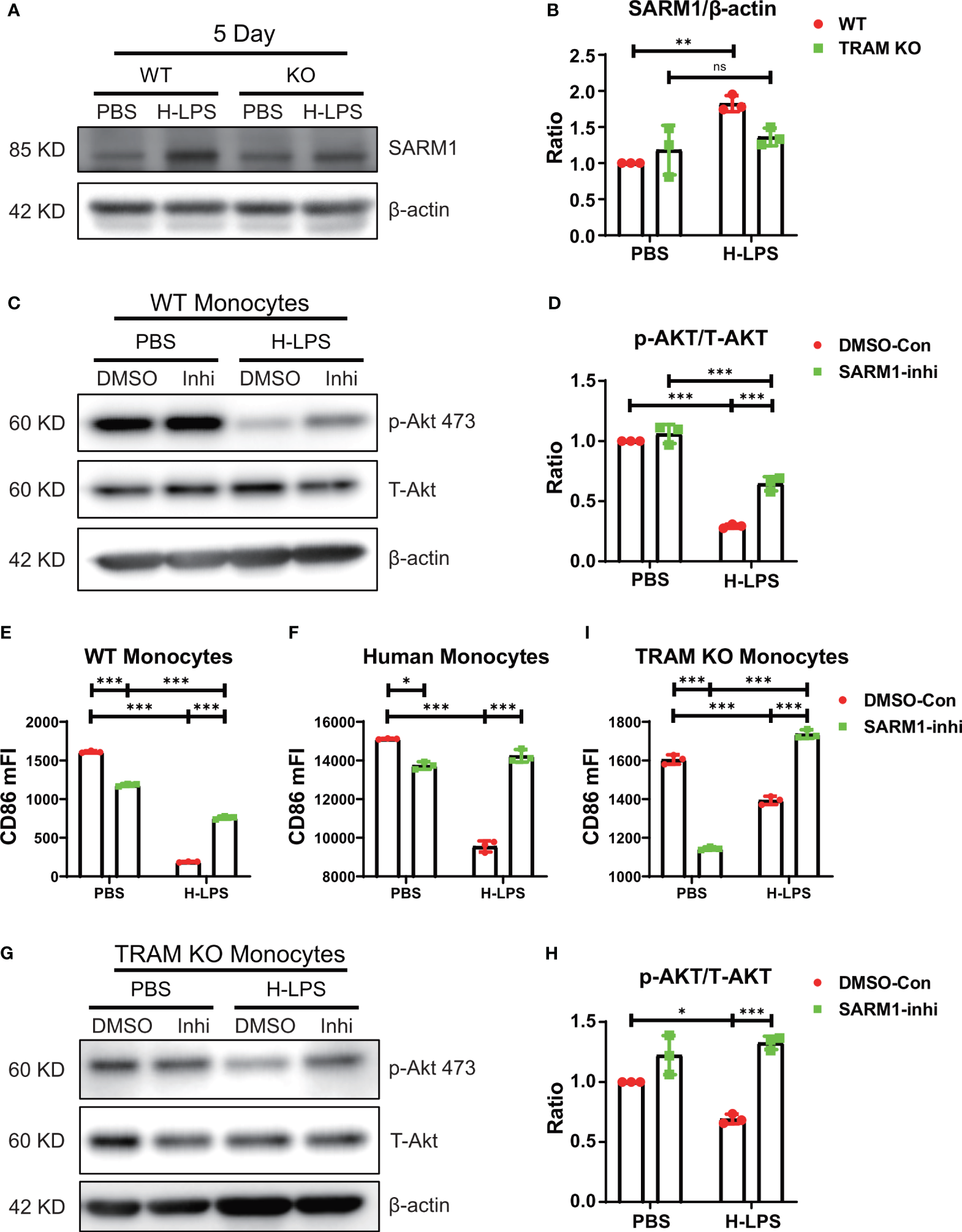 TRAM works synergistically with SARM1 in driving monocyte exhaustion. (A, B) BMDMs from WT and TRAM KO mice were stimulated with either PBS or H-LPS (100 ng/mL) for 5 days. The level of SARM1 expression was determined by western blot (A). The relative level of SARM1 was normalized to β-actin (B). (C–E) SARM1 inhibitor or DMSO control treated WT BMDMs were stimulated with either PBS or H-LPS (100 ng/mL) for 5 days. The levels of p-Akt and T-Akt expression was determined by western blot (C). The relative level of p-Akt was normalized to T-Akt (D). The expression of CD86 was analyzed with flow cytometry (E). The CD86 expression of SARM1 inhibitor or DMSO control treated human monocytes (F) was analyzed with flow cytometry. Cells were stimulated with either PBS or H-LPS (100 ng/mL) for 5 days. (G–I) SARM1 inhibitor or DMSO control treated TRAM KO mice BMDMs were stimulated with either PBS or H-LPS (100 ng/mL) for 5 days. The levels of p-Akt and T-Akt expression was determined by western blot (G). The relative level of p-Akt was normalized to T-Akt (H). The expression of CD86 was analyzed with flow cytometry (I). DMSO, DNSO Control; Inhi, SARM1 inhibitor. n=3. Error bars represent means ± SD. ns, not significant *p<0.05, **p<0.01, ***p<0.001.
