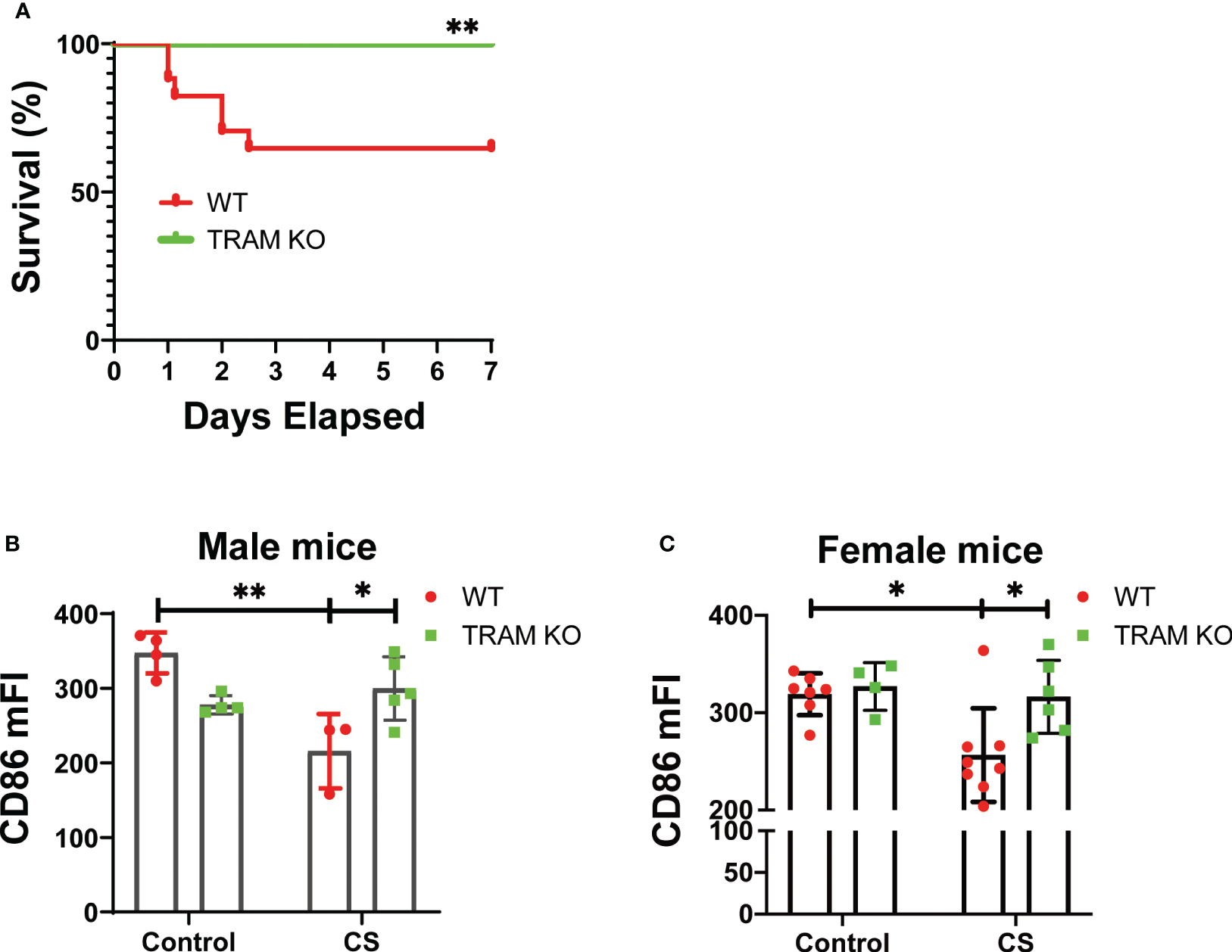 TRAM is involved in monocyte exhaustion in vivo during experimental sepsis. (A) The Kaplan-Meier survival plot of WT (17) and TRAM KO (16) male mice with sever sepsis induced by CS (~1.5 mg/g of BW) i.p. injection. *p<0.01. (B, C) WT and TRAM KO male (B) or female (C) mice were i.p. injected with CS (~0.9 mg/g of BW) to induce mild sepsis. The bone marrow monocytes CD86 expression were analyzed through flow cytometry at day 6 after CS injection. n=3-8 mice/group. Error bars represent means ± SD. *p<0.05, **p<0.01.