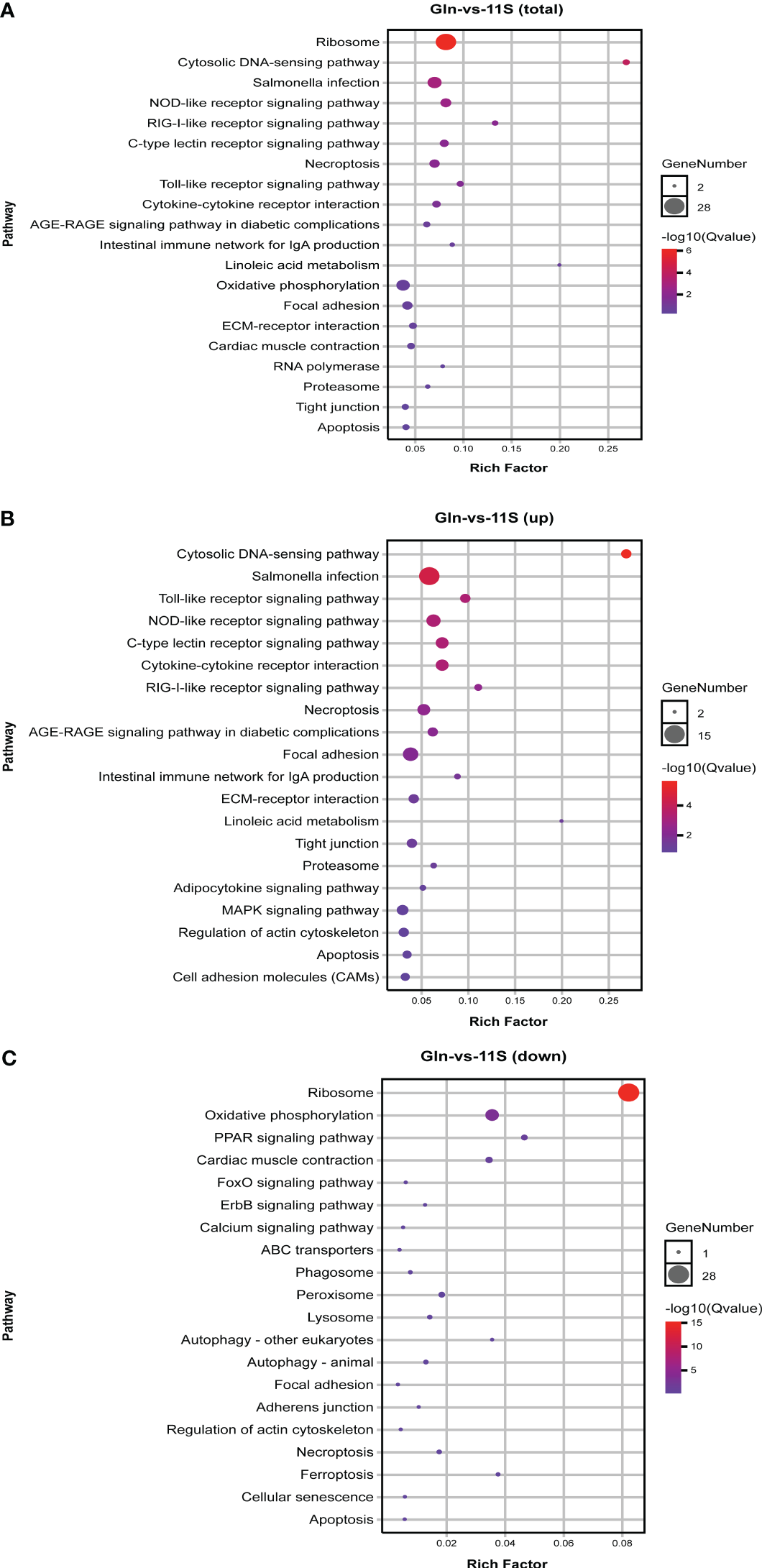 Figure 3 KEGG pathways enrichment analysis for differentially expressed genes (DEGs) in Gln-vs-11S comparison group. (A) Enrichment by total DEGs. (B) Enrichment by upregulated DEGs. (C) Enrichment by downregulated DEGs.