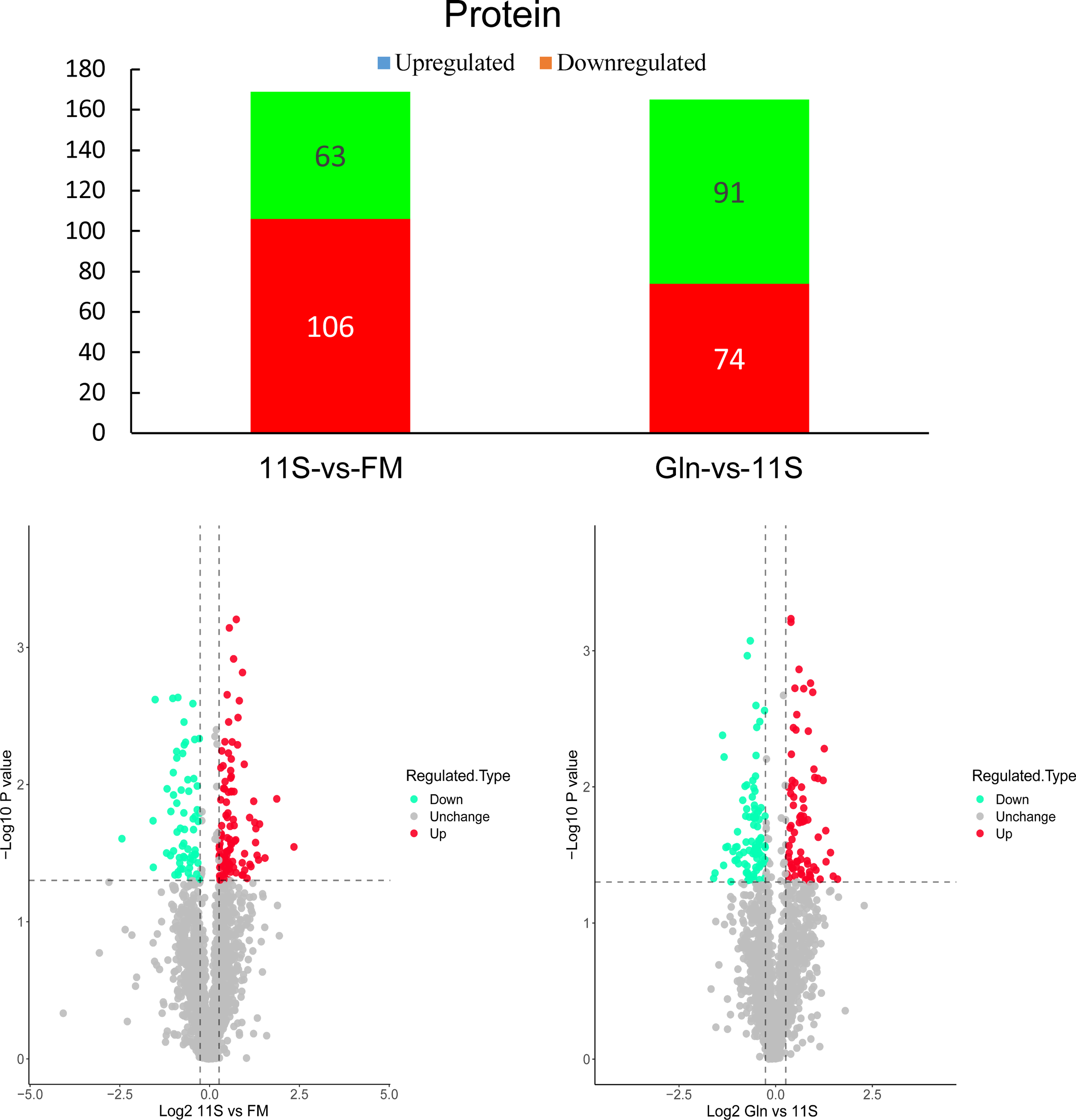 Figure 4 Analysis of histogram and volcano plot of differentially expressed proteins (DEPs) in both 11S-vs-FM and Gln-vs-11S comparison groups. The horizontal and vertical axis in the volcano plot represents the DEPs value and -log10 p-value, respectively. In this visualization, upregulated DEPs are denoted by red dots. Conversely, downregulated DEPs are denoted by green dots. Proteins displaying no significant difference in expression are marked by gray dots.
