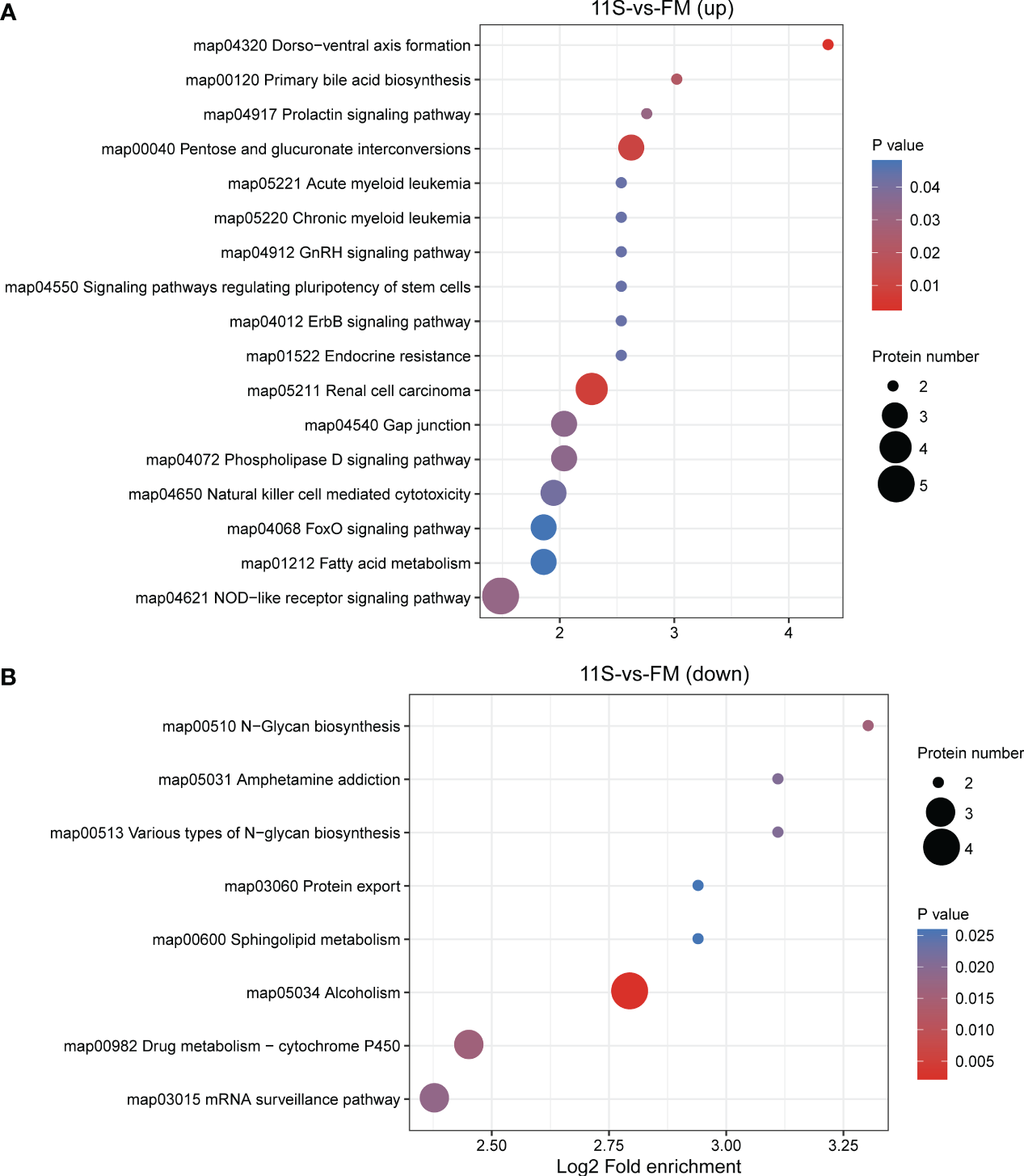 Figure 5 Enrichment analysis of KEGG pathway for differentially expressed protein (DEPs) in 11S-vs-FM comparison group. Log2 Fold enrichment is displayed on the horizontal axis, while the vertical axis denotes KEGG pathway names. Bubble size signifies protein counts within each pathway. The enriched P-value is represented by a color. (A) Enrichment by upregulated DEPs. (B) Enrichment by downregulated DEPs.