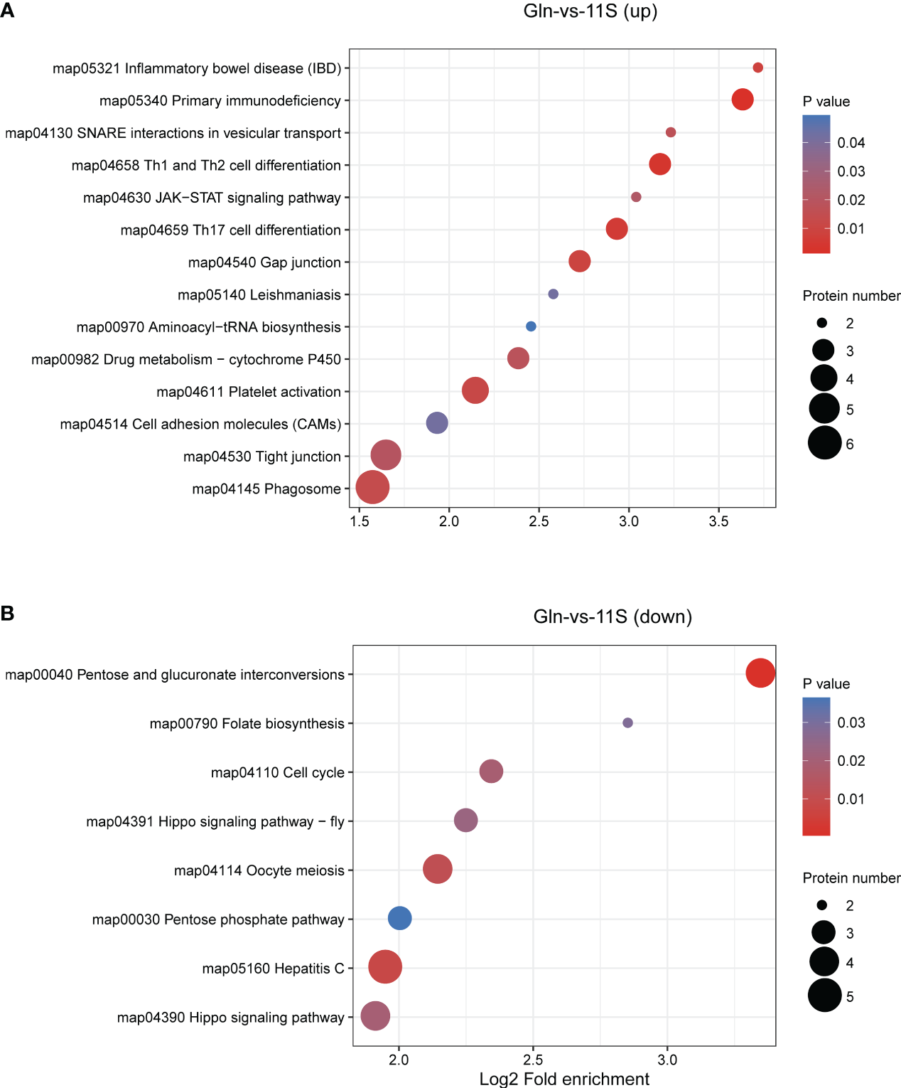Figure 6 Enrichment analysis of KEGG pathway for differentially expressed protein (DEPs) in Gln-vs-11S comparison group. Log2 Fold enrichment is displayed on the horizontal axis, while the vertical axis denotes KEGG pathway names. Bubble size signifies protein count within each pathway. The enriched P-value is represented by color. (A) Enrichment by upregulated DEPs. (B) Enrichment by downregulated DEPs.