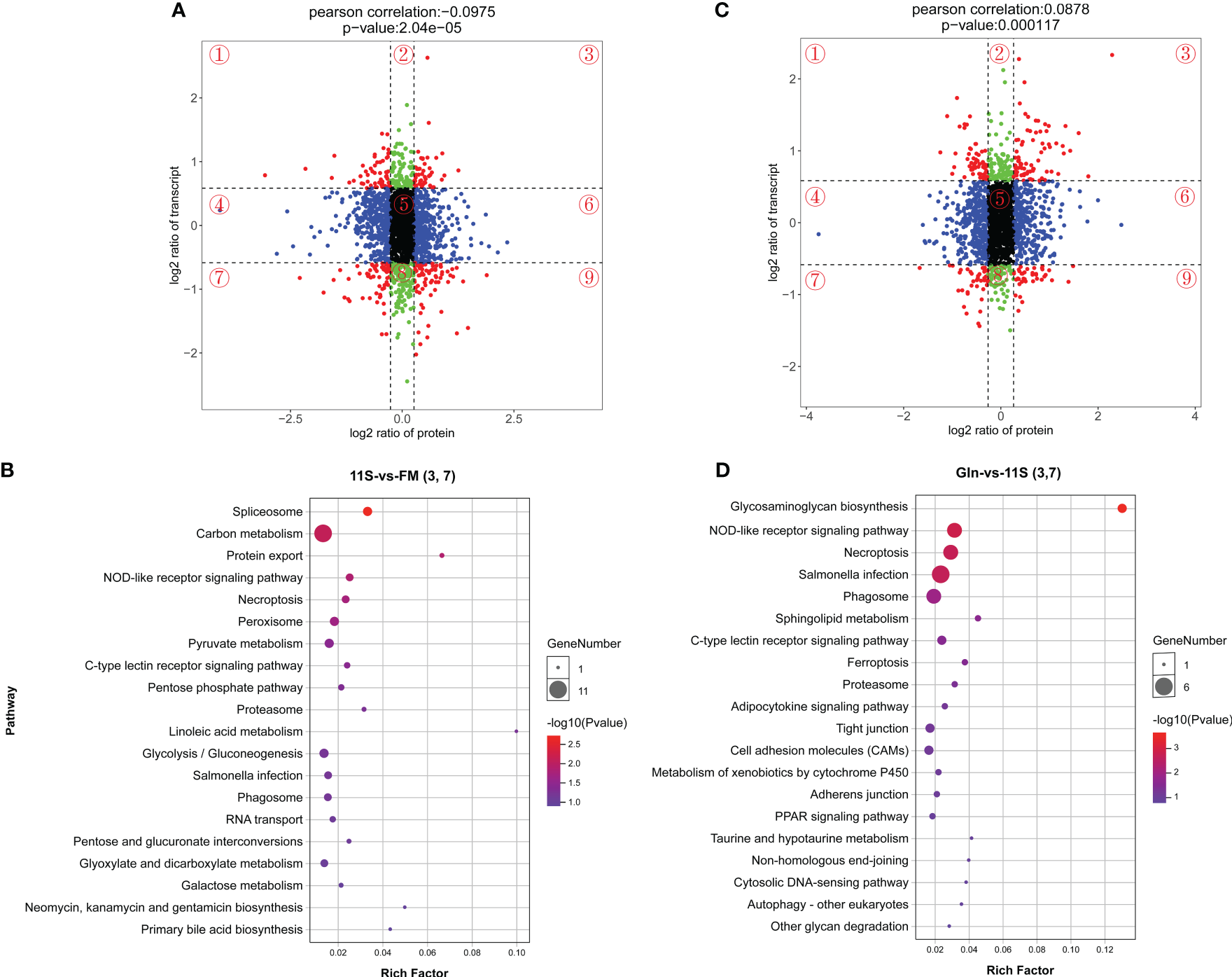 Figure 7 Top 20 KEGG enrichment analysis with differential mRNAs consistent with the corresponding differential protein expression (quadrants 3 and 7) in both the 11S-vs-FM and Gln-vs-11S group. The horizontal axis (A, C) represents the log2 ratio of protein, and the vertical axis (A, C) denotes the log2 ratio of transcript. The horizontal axis (B, D) indicates the rich factor, and the vertical axis (B, D) denotes the name of the KEGG pathway. Bubble size (B, D) indicates protein counts within each pathway. Enriched-log 10 P-value is represented by a color (B, D).