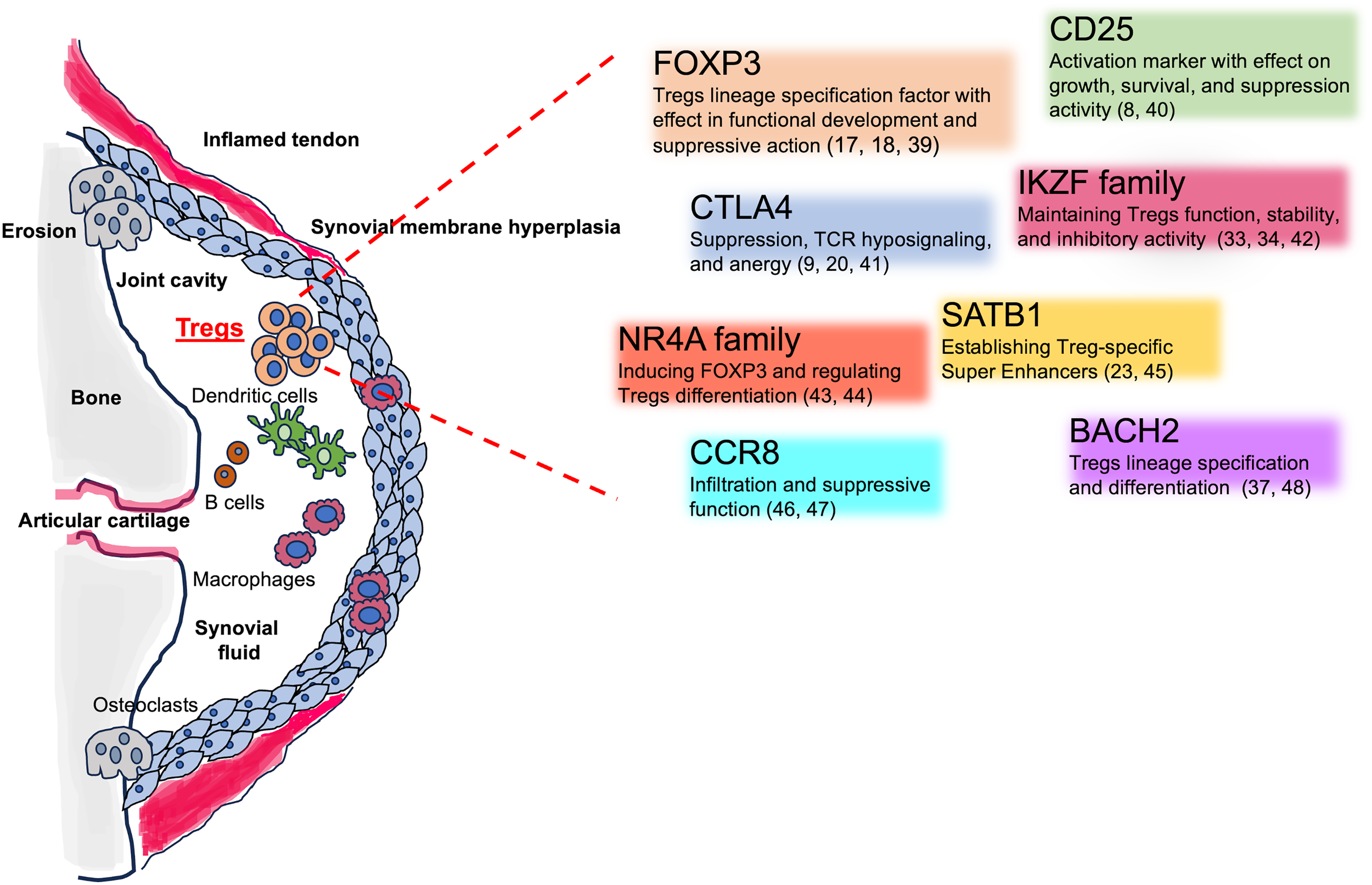 Figure 2 Tregs involvement in the SpA inflamed joints and Tregs key associated genes. The figure shows the different cellular players in in the inflamed joints, including Tregs. The cartoon encloses Tregs-associated genes, their mechanisms of action, and key references.
