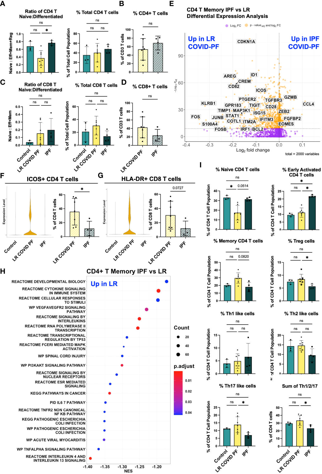Adaptive immune cells differentiate IPF and COVID-PF. (A) ScRNA-seq data of CD4+ T cells showing the ratio of naïve to differentiated (defined as the sum of effector, memory, and regulatory cells) and relative total abundance of CD4+ T cells in Control, LR COVID-PF, and IPF. (B) Protein quantification of relative total abundance of CD4+ T cells in LR COVID-PF and IPF as a percent of all CD3+ T cells. (C) ScRNA-seq data of CD8+ T cells showing the ratio of naïve to differentiated (defined as the sum of effector and memory cells) and relative total abundance of CD8+ T cells in Control, LR COVID-PF, and IPF. (D) Protein quantification of relative total abundance of CD8+ T cells in LR COVID-PF and IPF as a percent of all CD3+ T cells. (E) Volcano plot showing differentially expressed genes between IPF and LR COVID-PF generated from MAST analysis for CD4+ T memory cells where positive log2FC values represent genes upregulated in IPF relative to LR COVID-PF and negative log2FC represent genes upregulated in LR COVID-PF relative to IPF. Y axis of the volcano plot is the -log10 of the padj-value calculated using Bonferroni correction to correct for multiple testing. (F) Violin plots showing gene expression of ICOS in CD4+ T memory cells between control, ER COVID-PF, and LR COVID-PF and quantification of the percent of CD4+ T cells expressing ICOS at the protein level from imaging with the PhenoCycler. (G) Violin plots showing gene expression of MHC-II molecules (HLA-DR) in CD8+ T effector cells between control, ER COVID-PF, and LR COVID-PF and quantification of the percent of CD8+ T cells expressing HLA-DR at the protein level from imaging with the PhenoCycler. Gene expression of ICOS in LR COVID-PF CD4+ T memory cells and HLA-DRA in LR COVID-PF CD8+ T effector cells is signifcantly lower than control and ER COVID-PF where padj-value ≤ 1E-14 as determined by non-parametric Wilcoxon rank sum test and adjusted using Bonferroni correction. (H) Dot plot depicting GSEA analysis results of the top 20 pathways enriched in LR COVID-PF compared to IPF, where negative NES are enriched in LR COVID-PF relative IPF. (I) ScRNA-seq relative abuduances of the CD4+ T cells relative to the total CD4+ T cell population for control, LR COVID-PF, and IPF. Transcript data acquired through scRNA-seq is displayed as solid bar charts, while protein data acquired through multiplex imaging on the PhenoCycler are displayed as striped bar charts. Kruskal Wallis test with Dunn’s multiple comparison test was used to test significance when comparing ER COVID-PF, LR COVID-PF, and non-diseased control in (A, C, I). Mann-Whitney U test was used when comparing two groups in (B, D, F, G). *p ≤ 0.05, and ** p ≤ 0.01. All non-significant values p ≤ 0.1 are shown.