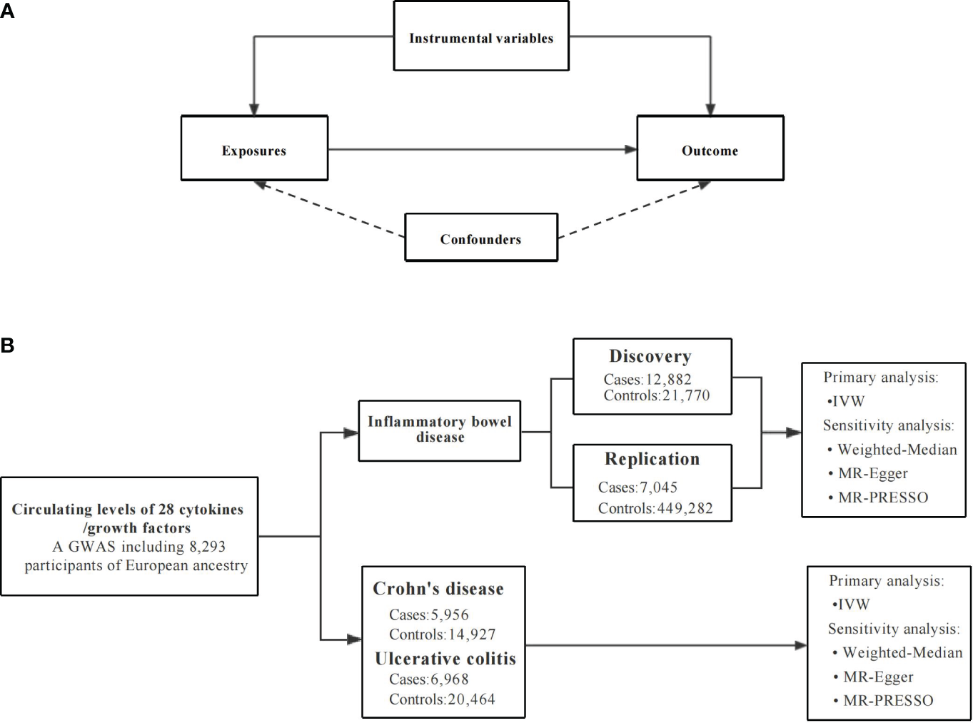 Prior epidemiological studies have established a correlation between inflammatory cytokines and inflammatory bowel disease (IBD). However, the nature of this relationship remains uncertain. Mendelian randomization (MR) study has the advantages of avoiding confounding and reverse causality compared with traditional observational research.