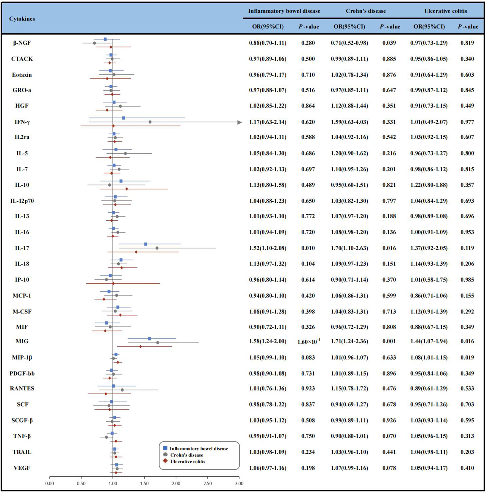 In our study, we used MR methods to systematically screen the causal associations of 28 cytokines with IBD (including CD and UC). We identified MIG was significantly associated with IBD risk, and IL-17 was suggestively associated. Additionally, the findings for the two IBD subtypes showed that circulating MIG was also suggestively linked with a higher risk of CD and UC. Furthermore, we observed potential links between elevated levels of circulating β-NGF, and IL-17 with the altered risk of CD. Moreover, we noticed a suggestive association between MIP-1β and UC. The reverse MR did not support their reverse associations.