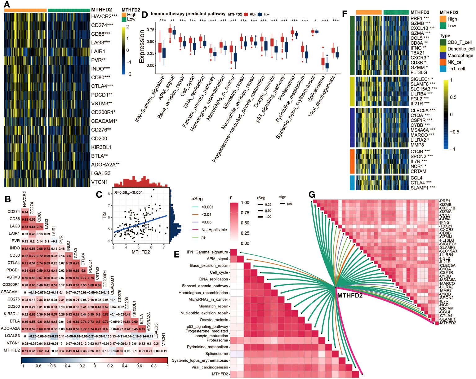Validation of the correlation between MTHFD2 expression and biomarkers of ICB response in the GSE48075 cohort (A) Comparison for expression of immune checkpoints between the high- and low-MTHFD2-expression groups in bladder cancer. (B) The correlation between MTHFD2 expression and immune checkpoints using Pearson’s correlation analysis. (C) Correlation between MTHFD2 expression and T cell-inflamed scores in bladder cancer in the GSE48075 cohort. (D) Comparison for enrichment scores of immune predicted pathways between the high- and low-MTHFD2-expression groups in bladder cancer. (E) The correlation analysis between MTHFD2 expression and enrichment scores of immune predicted pathways. (F) Comparison for expression of effector genes derived from anti-tumor cells in the high- and low-MTHFD2-expression groups. (G) The correlation analysis between MTHFD2 expression and expression of effector genes derived from anti-tumor cells (*p< 0.05, **p< 0.01, ***p< 0.001, ns means not significant, pos means positive correlation, and neg mean negative correlation).