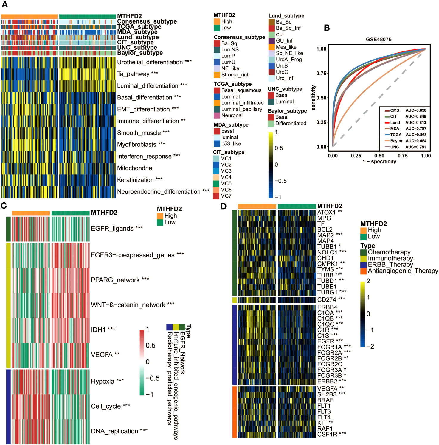 MTHFD2 expression was closely related to the molecular subtype and response for various clinical treatment strategies of bladder cancer in the GSE48075 cohort. (A) Distribution of bladder cancer molecular subtypes calculated via multiple algorithms in patients with different MTHFD2 expression levels. (B) Receiver operating characteristics (ROC) curve and area under curve (AUC) for MTHFD2 in molecular subtype prediction in the GSE48075 cohort. (C) Comparison for enrichment scores of various therapeutic effects predictive signature in the high- and low-MTHFD2-expression groups in bladder cancer. (D) Comparison for expression of various drug-targeted genes in the high- and low-MTHFD2-expression groups in bladder cancer (*p< 0.05, **p< 0.01, ***p< 0.001).