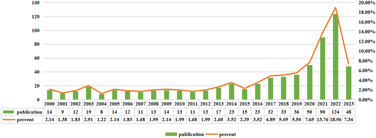 Based on the search strategy we employed, there were a total of 654 studies of immunotherapy in relation to cervical carcinoma over the course of the last 24 years, including 469 “articles” and 185 “reviews”. As shown in Figure 2, Judging from the growth rate of the number of publications each year, it can be observed that the field of immunotherapy in cervical carcinoma was in its early stages of research from 2000 to 2015. The annual publication volume was less than 20 articles and an average annual publication number of about 14. However, there has been a significant shift in the number of publications in the field from 2016 to 2022. The average annual publication number during this period was approximately 55, showcasing a substantial increase compared to previous years. The number of relevant publications published in 2022 was 124, 5.4 times that of 2016. Currently, 48 articles have been published in August 01 2023, and it is believed that a new peak will be reached by the end of the year.